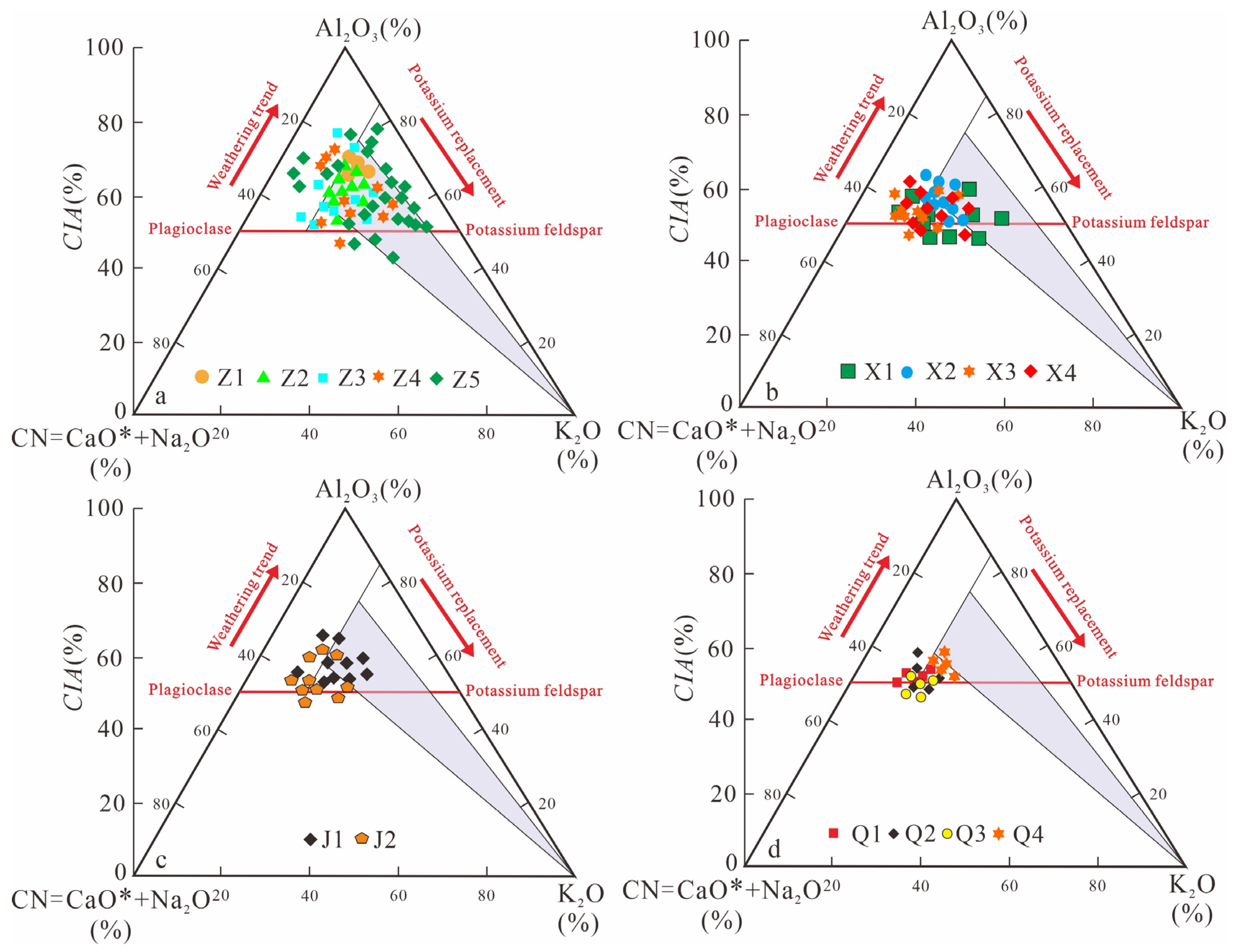We analyzed the weathering degree of tight sandstone minerals in different areas of the Shaximiao Formation in the Western Sichuan Depression through a chemical change index triangle diagram. The projection of data points in Zone Z is mainly distributed within the shadow triangle formed by the weathering trend line, potassium metasomatism line, and feldspar content line, with a CIA mean of 61.23% (Figure 11a). The data points in the X and Q regions are mostly projected outside the shadow triangle, with CIA mean values of 54.25% and 52.74%, respectively, indicating weak weathering (Figure 11b,c). The projection distribution of data points in region J is relatively scattered, with a CIA mean value of 55.13% (Figure 11d).