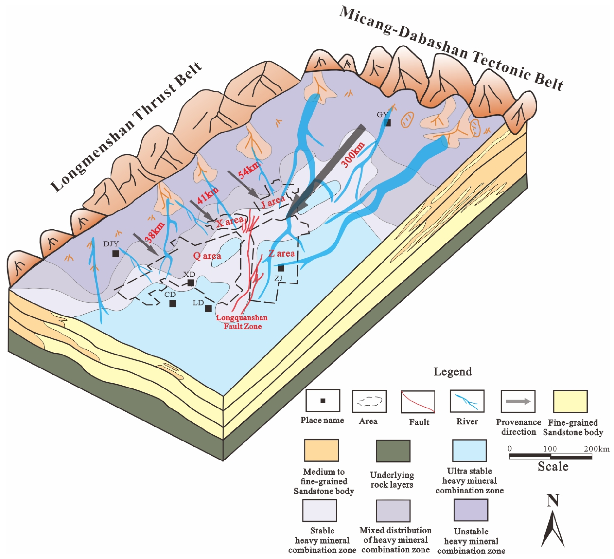 The provenance characteristics of region J are similar to those of regions X, Q, and J, indicating that it has dual provenance, mainly from Longmen Mountain in the west and MDTB in the northeast. The western region is 54 km (the approximate distance during the sedimentation period) away from the provenance area in a straight line, while the northeast region is relatively far away (less than 300 km) from the provenance area (Figure 12).