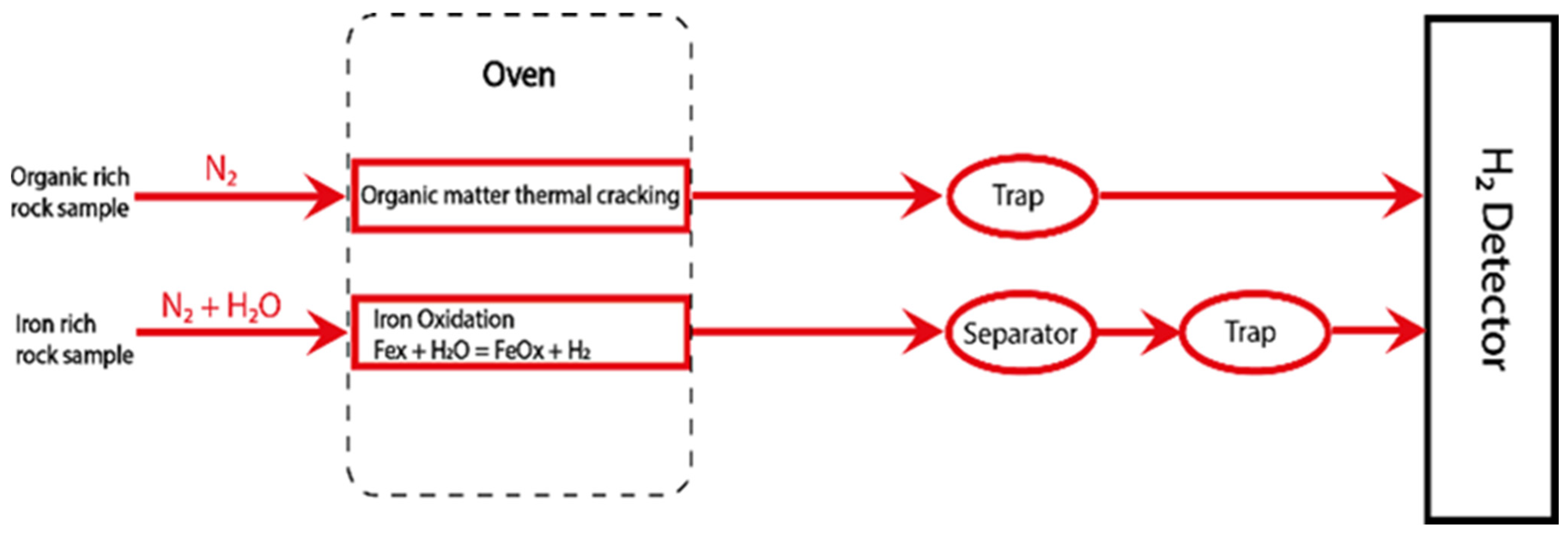 - Li, X.; Krooss, B.M.; Weniger, P.; Littke, R. Molecular Hydrogen (H2) and Light Hydrocarbon Gases Generation from Marine and Lacustrine Source Rocks during Closed-System Laboratory Pyrolysis Experiments. J. Anal. Appl. Pyrolysis 2017, 126, 275–287. [Google Scholar] [CrossRef]