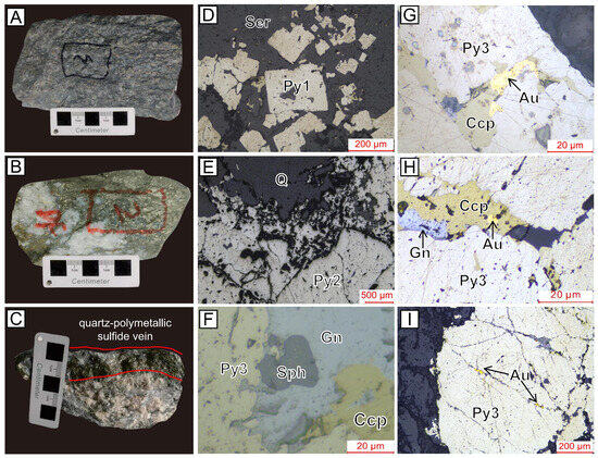 Characteristics of ore samples and metallic mineral assemblages in the Linglong gold deposit. (A) Pyrite–quartz–sericite stage ore; (B) Quartz–pyrite stage ore; (C) Quartz–polymetallic sulfide stage ore; (D) Euhedral to subhedral pyrite from the Py1 stage; (E) Subhedral to anhedral pyrite from the Py2 stage, with dissolution textures formed at the edges of pyrite; (F) Metallic sulfide mineral assemblage from the Py3 stage; (G–I) Different occurrences of native gold ((G) Intercrystalline gold; (H) Encapsulated gold; (I) Fracture gold). Py: Pyrite, Gn: Galena, Sph: Sphalerite, Apy: Arsenopyrite, Au: Native gold.