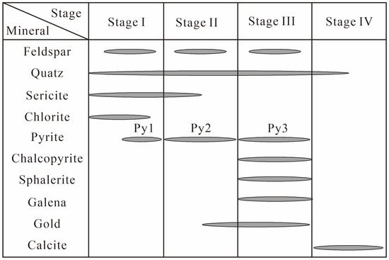 Based on the orebody occurrence, ore mineral assemblage characteristics, wall-rock alteration features, and vein cross-cutting relationships, the metallogenic process of the Linglong gold deposit is divided into 4 stages (Figure 4).