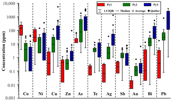 Fifty-seven pyrite grains were analyzed using LA-ICP-MS in this study, including 12 points for Py1, 20 for Py2, and 25 for Py3. The test data are presented in Supplementary Table S1. Based on the pyrite analysis results, trace element boxplots for the three types of pyrite were generated (Figure 5). Analytical results show that concentrations of elements such as Co, Ni, Cu, Zn, As, Te, Ag, Sb, Au, Bi, and Pb are generally above the detection limit, with only some data points falling below it.