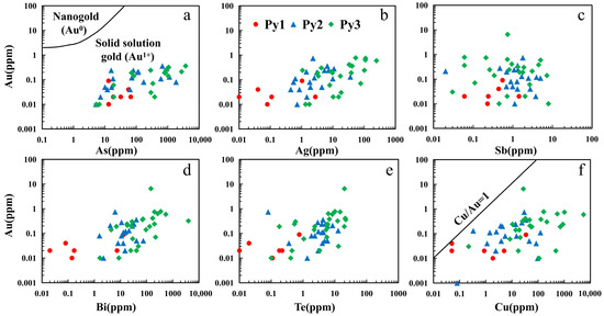 In the Au-Ag binary diagram (Figure 6b), the data points exhibit a scattered distribution, suggesting possible variations in the occurrence forms of Ag across different mineralization stages. During the early mineralization stage (Py1), Ag content is relatively low and shows no clear correlation with Au, whereas in the later mineralization stages (Py2 and Py3), the correlation between Ag and Au becomes more pronounced.