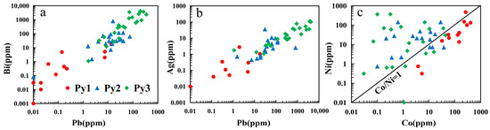 Trace element binary diagrams of pyrite from the Linglong gold deposit. (a) Pb-Bi diagram; (b) Pb-Ag diagram; (c) Co-Ni diagram.