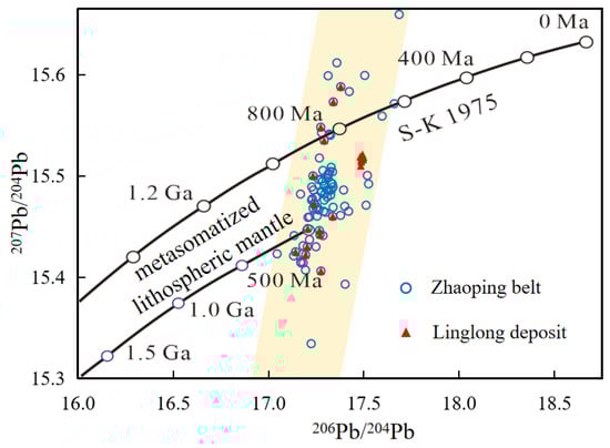 Linglong gold deposit lead isotopes show concentrated ratios, with rare outliers likely from radiogenic Pb contamination. Low μ (7.98–8.64) and ω (31.87–37.47) values indicate non-radiogenic Pb (Table 2), suggesting a mantle origin or minimal radiogenic Pb input. Single-stage model ages (652–940 Ma, avg. 804 Ma) predate host rock emplacement (166–149 Ma) and mineralization (120 Ma), but postdate Jiaodong Group protolith (3.4–2.6 Ga) and metamorphism (~1.8 Ga) [2,35,85]. This implies an ancient non-radiogenic Pb reservoir, not directly derived from host rocks or syn-mineral magmatism. Lead isotopes from Linglong and other Zhaoping Fault Zone deposits exhibit high-slope, mixed-source trends. Most data plot below the S-K 1975 curve and above the metasomatized lithospheric mantle (Figure 9), indicating a mixed source of crust and/or metasomatized lithospheric mantle.