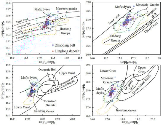 Tectonic diagrams of 207Pb/204Pb vs. 206Pb/204Pb and 208Pb/204Pb vs. 206Pb/206Pb models. The Pb isotope data of the host rocks are cited from the references in Yang et al. (1986) [89], Chen et al. (1994) [90], Hou et al. (2006) [91], Tan et al. (2012) [92], Ma et al. (2014) [34] and Deng et al. (2020) [56]. For detailed data, please refer to Supplementary Table S3.