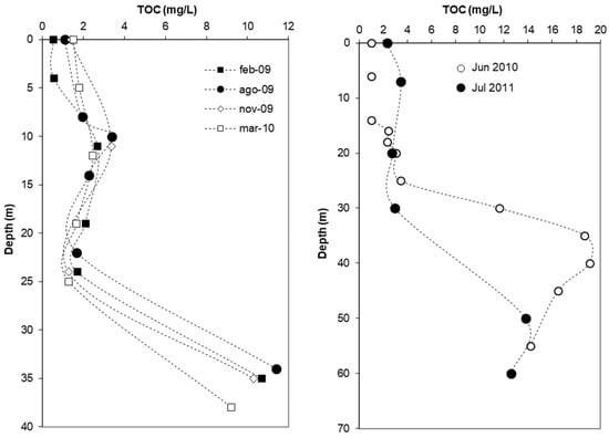 Total organic carbon (TOC) concentrations measured in the studied lakes are given in Table 3, and the vertical evolution of TOC in CM and HE-G is illustrated in Figure 2. TOC contents differ greatly between lakes and also vary significantly with depth within a given pit lake. TOC in the upper meters of the water column is consistently low in all the studied lakes (0.54–1.61 mg/L), most probably as a result of the low external carbon inputs from the drainage basin. These TOC contents are much lower than those found in freshwater rivers worldwide, where TOC content is ~9–10 mg/L TOC on average [51]. TOC in the lake’s deeper waters is related to nutrient availability and phytoplankton biomass in the photic zone [9,10,11,12]. In the relatively unproductive ST pit lake, a low nutrient content in the mixolimnion (see below) has resulted in poor phytoplankton development, as revealed by low chlorophyll a concentrations [10]. This situation leads to a low organic carbon flux (via settling of dead microalgal biomass) to the lake bottom. In contrast, in more biologically productive pit lakes such as CM and HE-G, higher nutrient concentrations lead to greater phytoplankton development near the chemocline and, consequently, greater fluxes of organic carbon input to the deeper levels (Figure 2). Maximum TOC concentrations measured at depth in CM and HE-G are 10 mg/L and 19 mg/L, respectively. This TOC includes particulate carbon and “dissolved” (<0.1 µm) organic carbon, possibly derived from organic matter degradation. In CM, particulate organic carbon represents about one-third (~37%) of the total carbon below the DCM at 10 m depth (Table 1). This percentage is reduced to one-fourth (~25%) near the lake bottom (35 m) and only represents 7% at intermediate depth (19 m), far from the most reactive zones (chemocline and lake bottom).