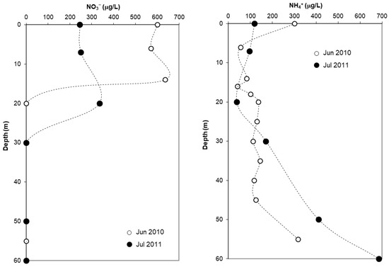 Vertical variation in nitrate (NO3−, left) and ammonium (NH4+, right) concentration in HE-G acidic pit lake, as measured in two different seasons.