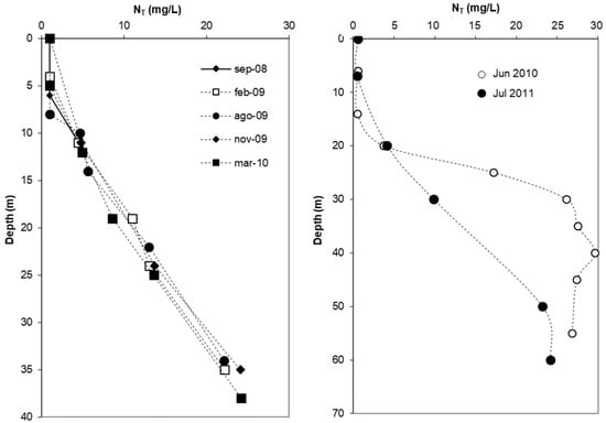 Total nitrogen (NT) concentrations increase notably with depth in all lakes (Table 3; Figure 5). The measured concentrations of total nitrogen are usually much higher than the DIN content, so that the remaining portion of nitrogen present in these acidic waters must be organic. The filtration results in the chemocline of CM suggest that 56% of this nitrogen is present in the particulate fraction (>0.1 µm; Table 1). As with TOC and phosphate, this nitrogen is mostly present as dead microalgal biomass coming from the photic zone [11]. However, this percentage of particulate nitrogen is notably reduced at depth, and only accounts for around 10% of total nitrogen in the monimolimnion (Table 1). The remaining 90% of this nitrogen could be present as various forms such as: (i) organic colloids (i.e., with particle diameters < 0.1 µm), (ii) organic compounds resulting from organic matter degradation (e.g., amino acids, proteins, amines, urea), and/or (iii) other compounds released during the acid dissolution of explosive remnants present in the mines.