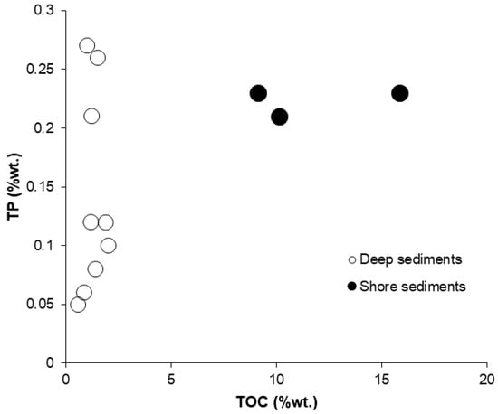 Binary diagram of total organic carbon (TOC) vs. total phosphorus (TP) in shallow and deep sediments of Cueva de la Mora pit lake.