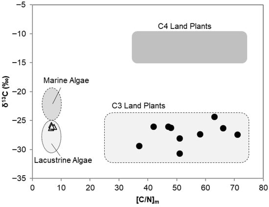 Binary plot of δ13C vs. [C/N] molar ratio showing the composition of phytoplankton (white triangles) and different plant species (black circles; taken from [25]) sampled in the CM acidic pit lake. Typical fields for well-known biogenic reservoirs (taken from [70]) have been included for reference.
