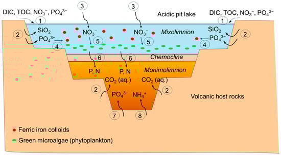 Schematic representation of the main sources and transformation pathways of nutrients identified in this study. The numbers indicated in the circles correspond to the following processes: 1, input from runoff; 2, acid leaching of host rocks; 3, atmospheric deposition; 4, adsorption to ferric iron colloids; 5, assimilation by microalgae and bacteria; 6, downward flux of settling phytoplankton biomass and ferric iron colloids; 7, desorption from Fe(III)-rich sediments; 8, release from sediments through organic matter degradation.