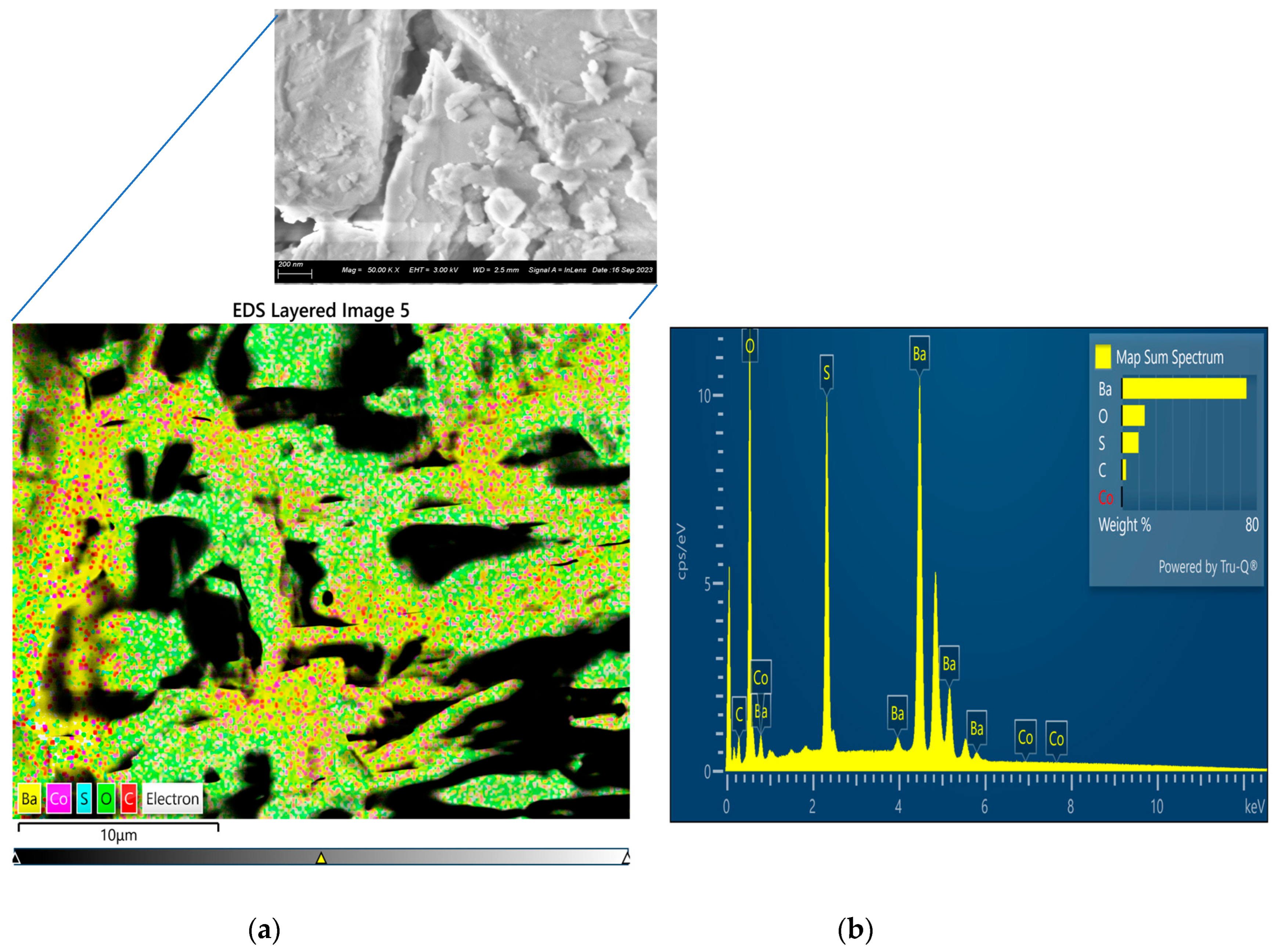 Figure 3. SEM images and EDS elemental mapping of barite rock material (a) SEM-EDS elemental mapping of sample IB5.These are the barite rock surfaces at nanoscale (200 nm) and the elemental mapping (SEM-elemental mapping) of rock surfaces at 25 microns. (b) are the results of the EDS analyses of barite rock sample IB5 which present the semi-quantitative compositional information from electron dispersive spectroscopy (EDS). The figures show the EDS peaks indicating the energies of each element.
