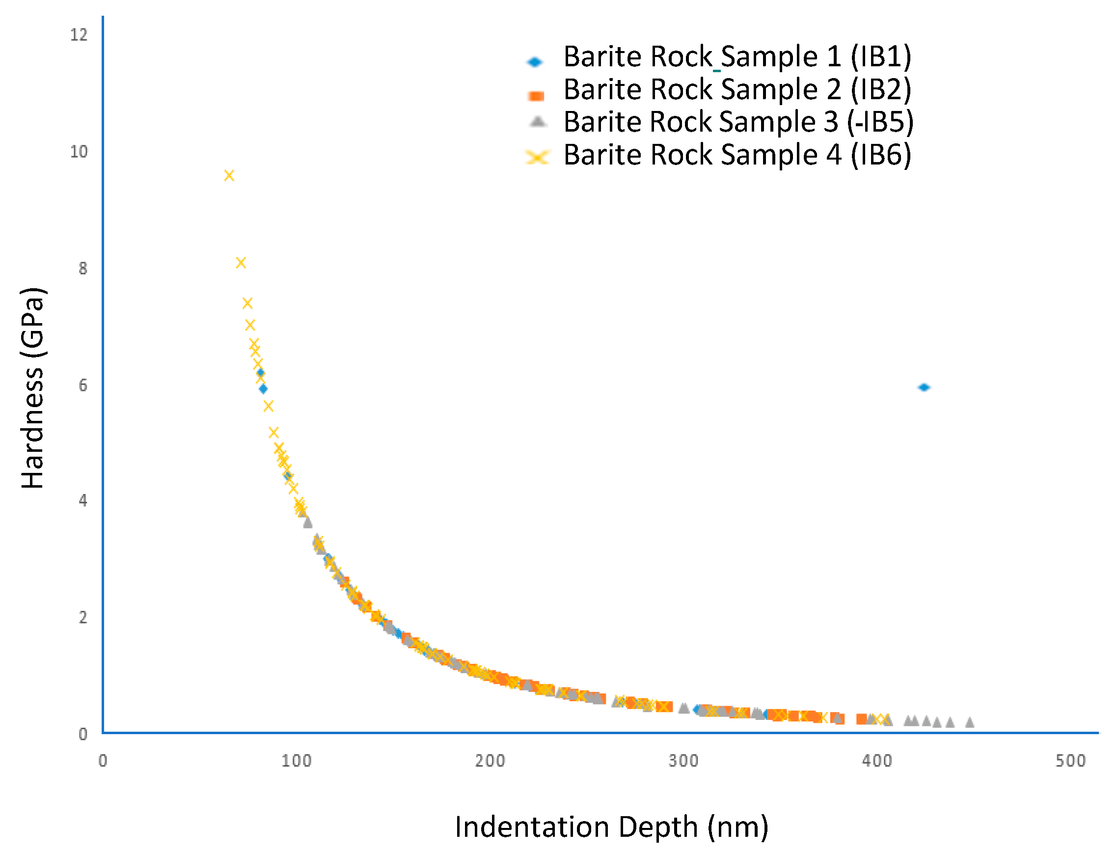 Figure 6. A figure showing the hardness values at various indentation depth obtained for the barite rock samples.
