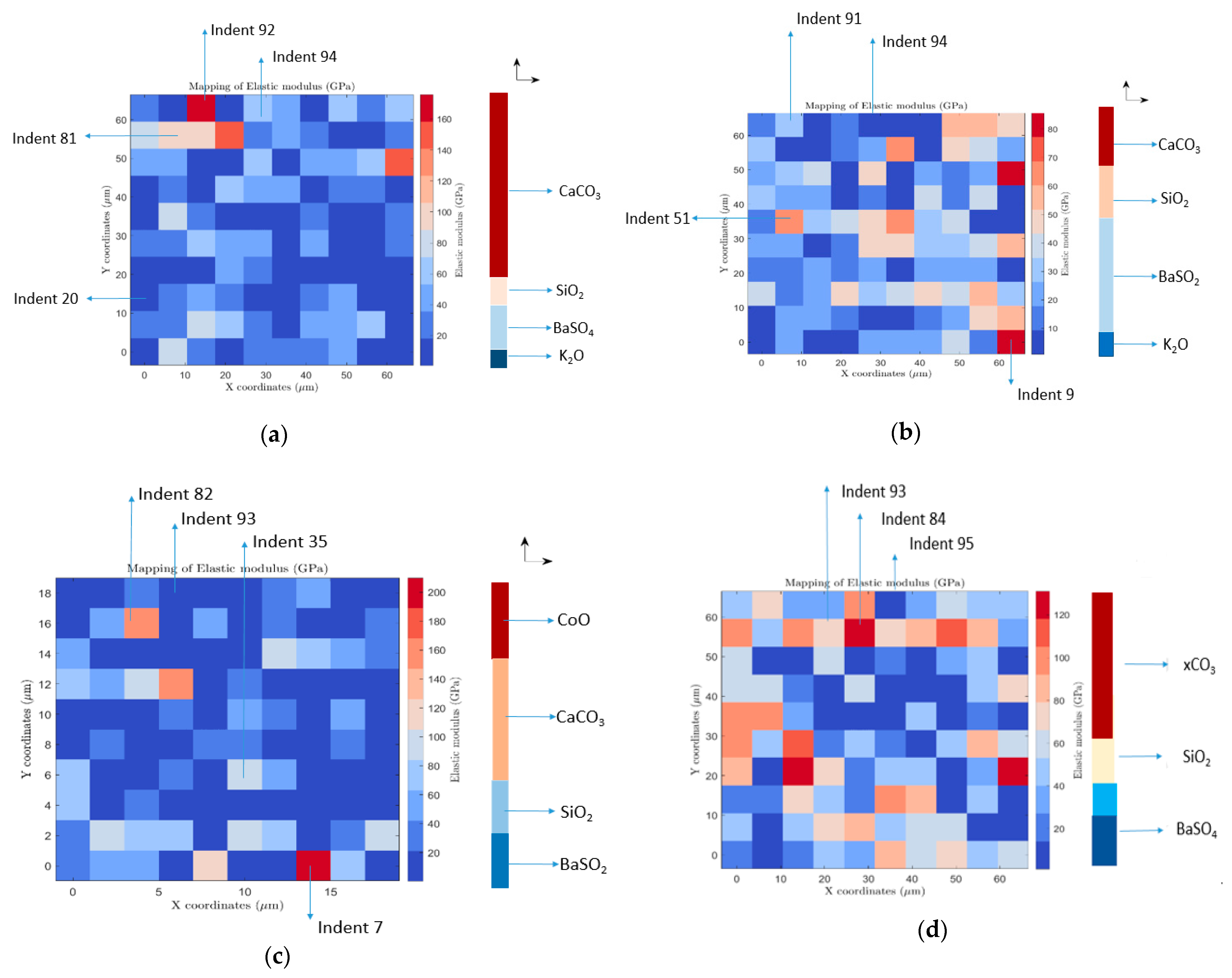 Figure 7. (ad) Spatial variations in elastic moduli of 100 indented points on each barite rock sample: (a) barite rock sample 1 (IB1), (b) barite rock sample 2 (IB2), (c) barite rock sample 3 (IB5) and (d) barite rock sample 4 (IB6).