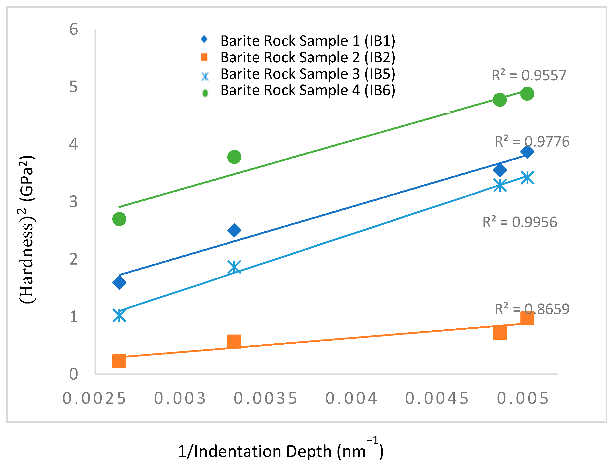 Figure 8. Plots of hardness squared (H2) versus the inverse of the indentation depth (h−1): for barite rock sample 1 (IB1), barite rock sample 2 (IB2); barite rock sample 3 (IB5) and barite rock sample 4 (IB6).