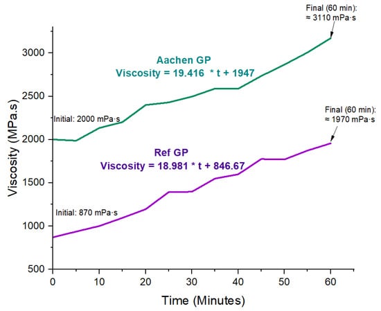 Viscosity measurements (; rotational viscometer with reading precision) confirmed the trends observed in the mini-slump tests (see Figure 4). Ref GP exhibited an initial viscosity of 870.6 mPa · s with a viscosity increase rate of 18.9 mPa · s/min, whereas Aachen GP showed a higher initial viscosity of 2001 mPa · s and a slightly steeper increase rate of 19.4 mPa · s/min. The higher initial viscosity and faster thickening rate of Aachen GP indicate reduced workability and quicker structural build-up due to the stiffening effect of the iron-rich slag. In Figure 4, the purple line represents Ref GP (100% BFS), and the green line represents Aachen GP (50% BFS + 50% iron-rich slag).