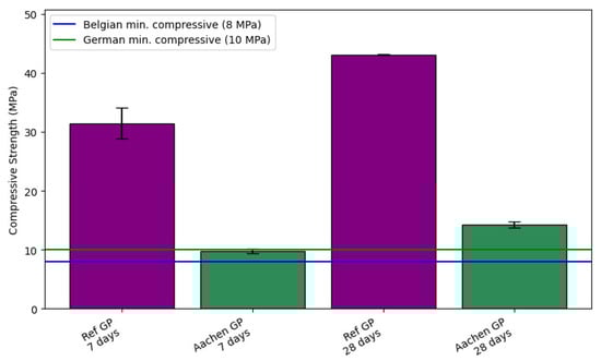 The setting time results further highlight the differences in early-age behavior between the two AAM formulations. Aachen GP required 32.9 h to reach its final set—nearly double the 16.4 h observed for Ref GP. Consistent with these kinetics, demoulding was performed when specimens could be handled without visible deformation. Ref GP, which reached final set sooner and showed lower initial viscosity with earlier calorimetric events, was safely demoulded after 24 h. Aachen GP, which exhibited higher initial viscosity, delayed final set, and attenuated/shifted heat-flow peaks, required 48 h before demoulding to ensure dimensional stability. Thus, the different demoulding times reflect measured setting behavior rather than an imposed procedural difference. These findings indicate that iron incorporation substantially reduces flowability, increases viscosity, and prolongs setting.
