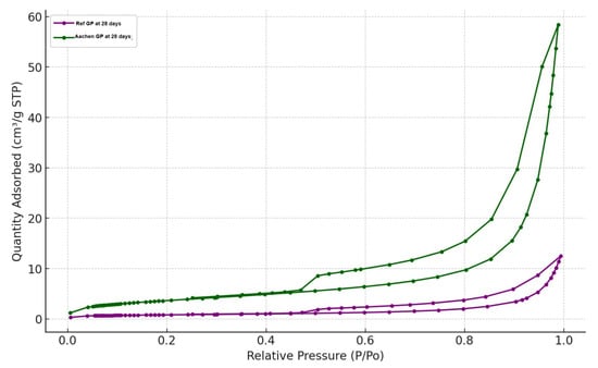 Moreover, the weaker decomposition peaks associated with layered double hydroxides (LDH) and carbonates in Aachen GP indicate fewer secondary hydration products, complementing the FTIR and XRD findings that revealed delayed gel formation and incomplete phase evolution. Adediran et al. [] highlighted that higher gel maturity corresponds to increased thermal signals from stable LDH and carbonate phases, a characteristic more evident in the Ref GP matrix.