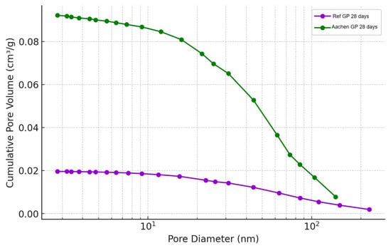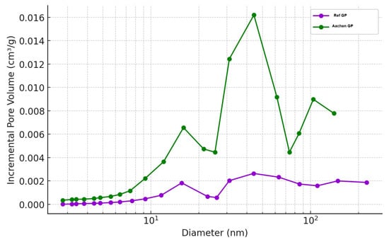 Thermogravimetric analysis (TGA) confirmed these microstructural differences, showing lower bound water and total mass losses for Aachen GP (4.59% and 8.32%, respectively) compared with Ref GP (9.13% and 13.43%), reflecting reduced gel formation and limited hydration.