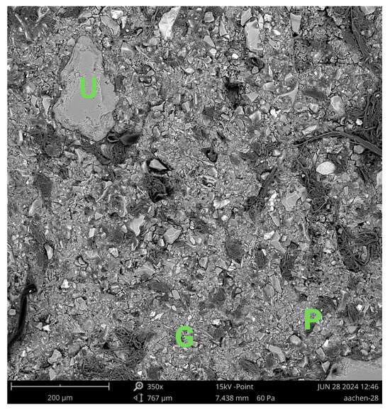 Scanning Electron Microscopy (SEM) imaging was conducted using a Phenom tabletop SEM operating at 15 kV in high-vacuum mode with the secondary-electron detector. The working distance was maintained at 10 mm, and a spot size of 3 nm was used. Approximately 1 cm3 cubic samples were embedded in Epofix resin, polished to a 1 µm surface finish, and gold-coated with a 5 nm layer. Sample preparation followed the SCK CEN resin-impregnation and polishing method [], and image quality was verified by optical microscopy during preparation. For each sample, multiple micrographs were acquired at different magnifications to assess morphological variation.