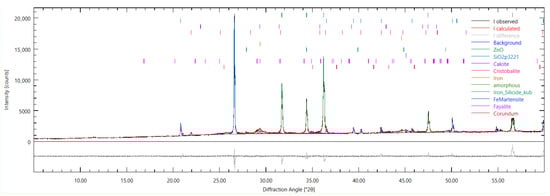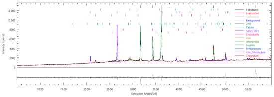 Phase identification and refinement were performed in Profex/BGMN using BGMN structure files (.str). Where available, the corresponding ICDD PDF reference numbers encoded in the .str headers are listed in Table 4 for traceability. No direct access to the ICDD database was required. ZnO was the only internal standard; any fitted corundum, when present, was treated as a minor accessory phase rather than an internal standard.