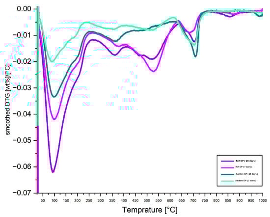 Thermogravimetric Analysis (TGA) was performed using a Netzsch STA 409PC instrument (NETZSCH-Gerätebau GmbH, Selb, Germany) on four samples: Ref GP and Aachen GP at 7 and 28 days.
