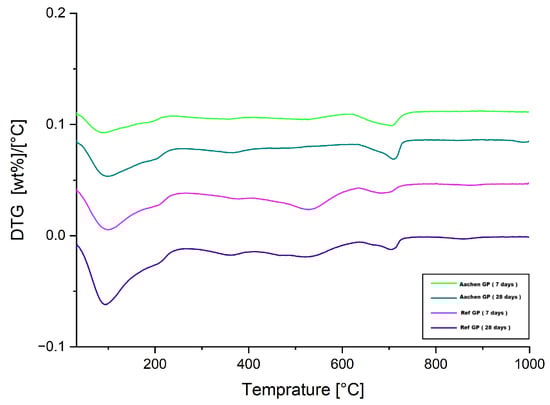 DTG curves of Ref GP and Aachen GP at 7 and 28 days, vertically shifted to aid visualization.