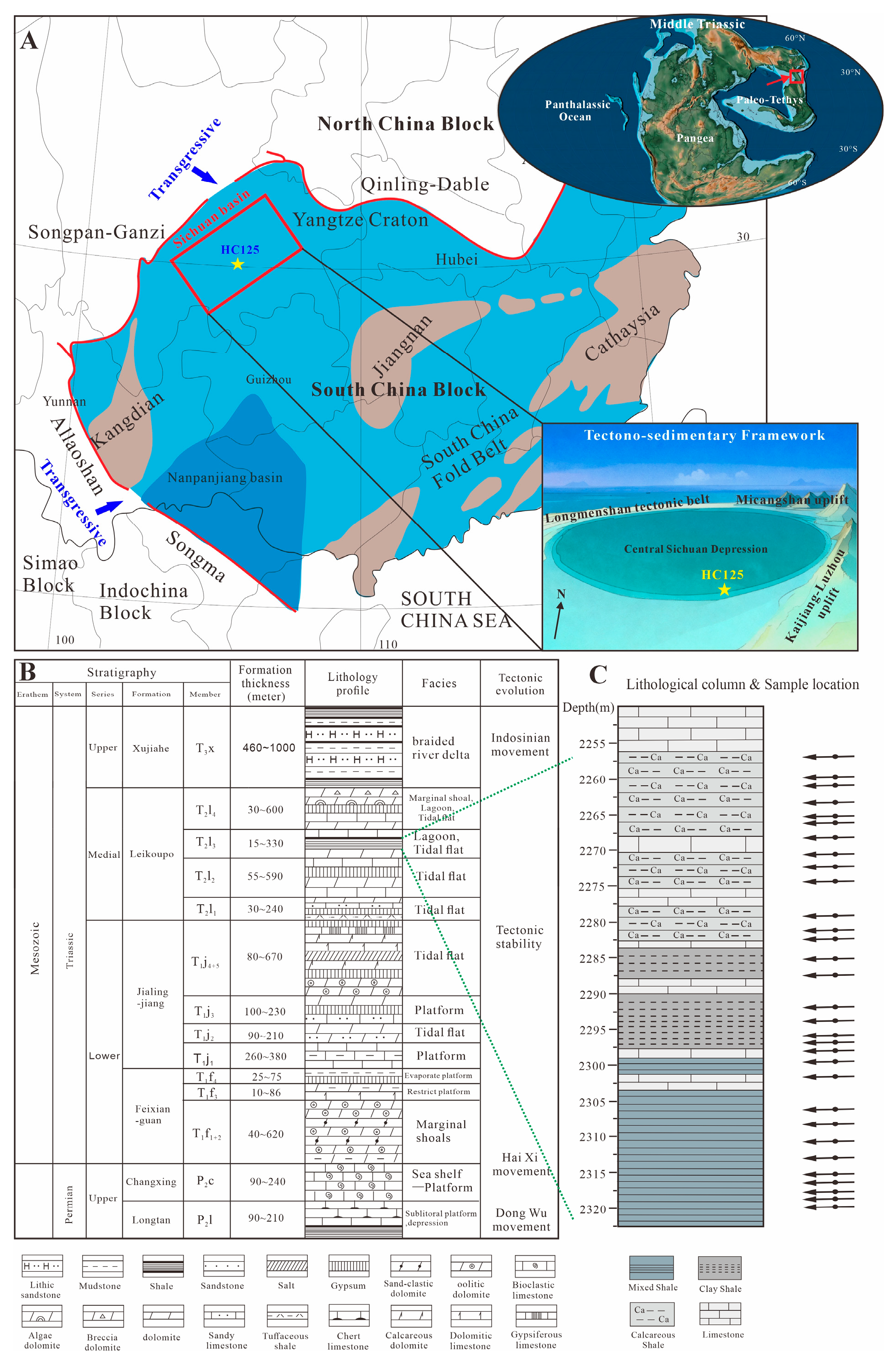 Figure 1. Geology of South China in the Middle Triassic. (A) Tectonic map illustrating major blocks of South China of the Middle Triassic interpreted suture zones and extent of the Nanpanjiang Basin and Yangtze Platform. ‘Old land’ is brown, shallow seas are pale blue, and deep marine basins are dark blue. (B). Lithostratigraphic column of the Central Sichuan Basin, showing major gas combination. Modified from reference [40]. (C). Stratigraphic column and shale sample (for subsequent geochemical analysis) location of the Lei3 shale of the HC125 Well.