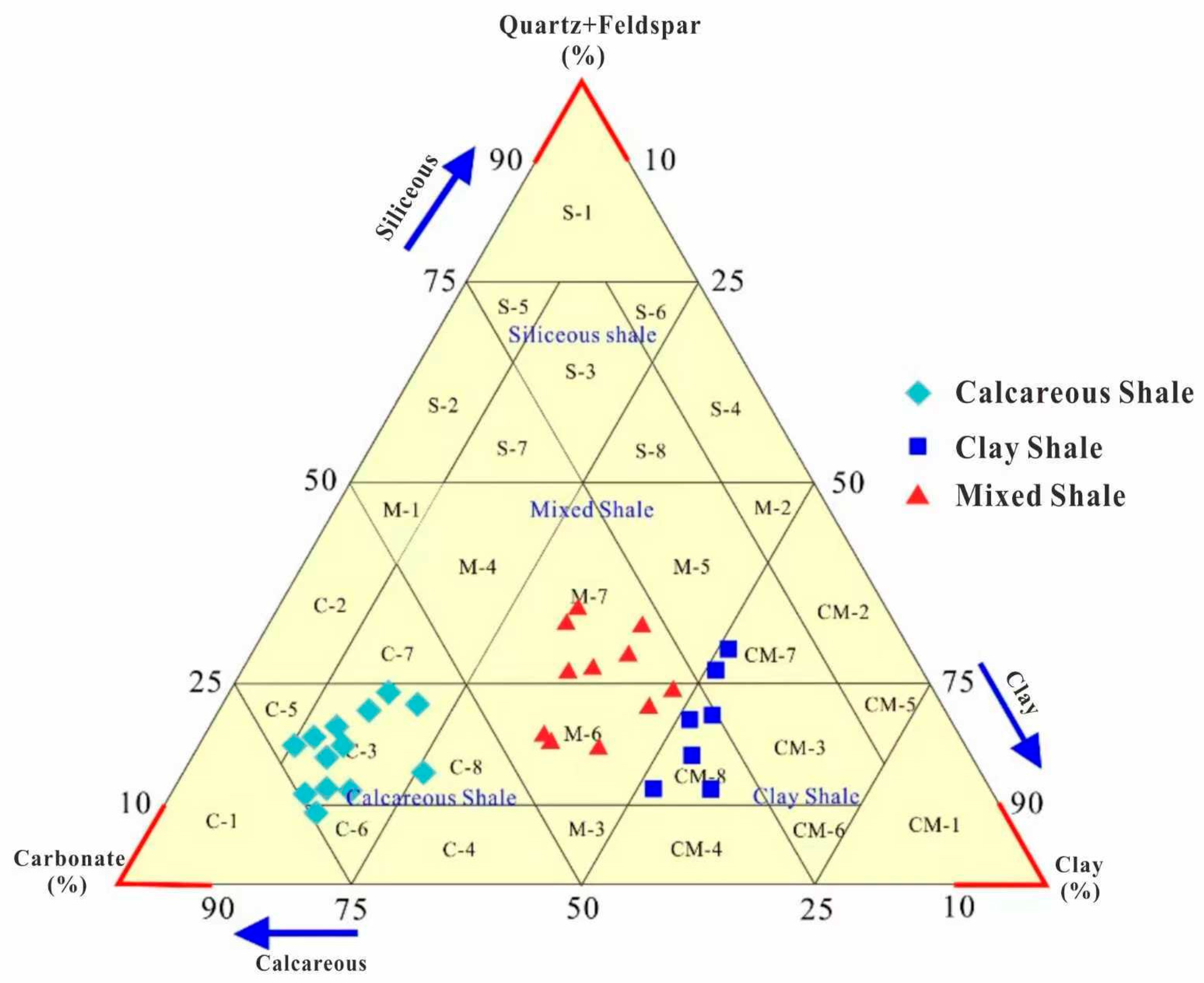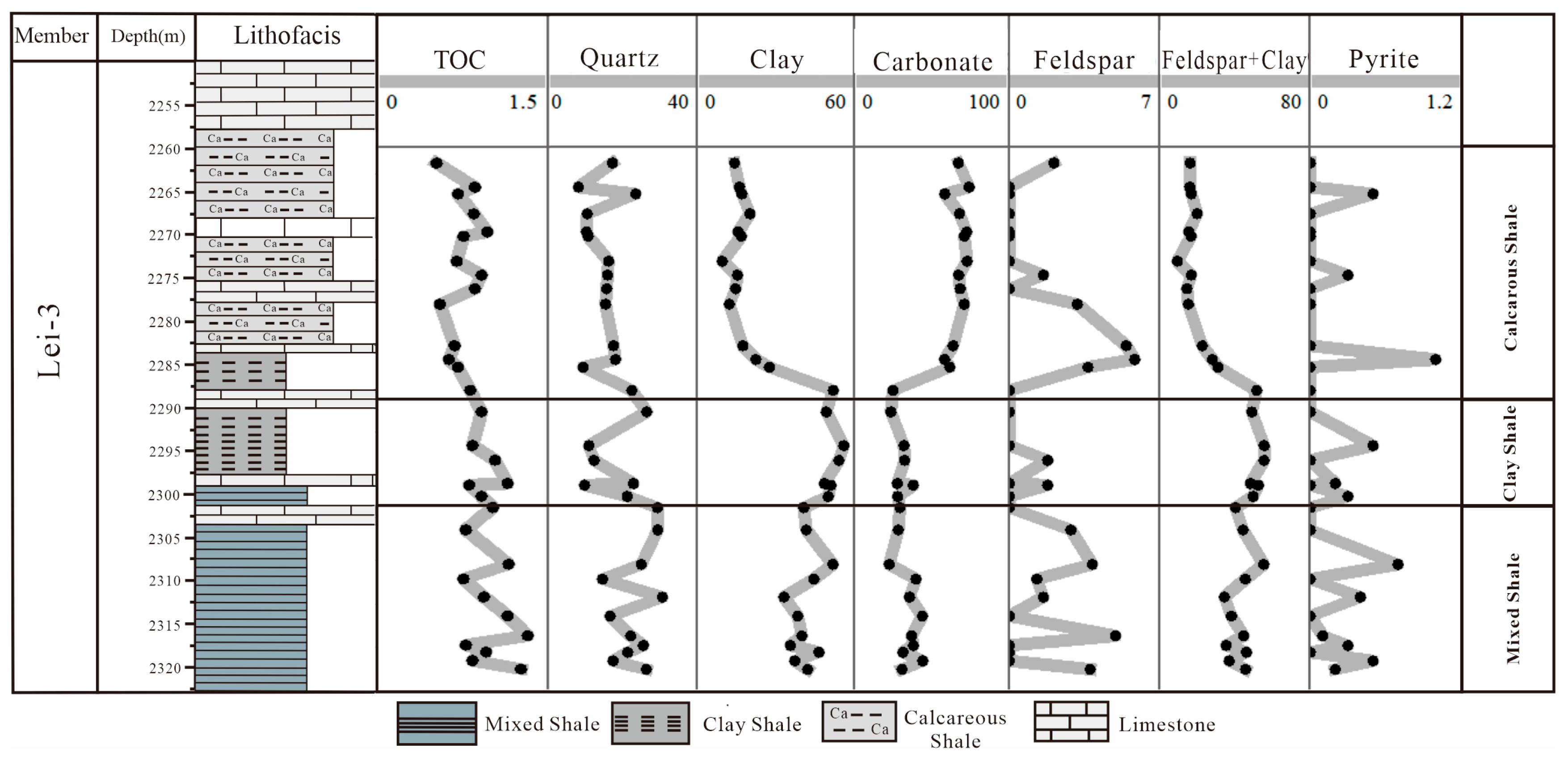 At present, using siliceous minerals (quartz + feldspar), carbonate minerals (calcite + dolomite) and clay minerals as the three terminal elements, the shale facies of the Lei3 Member can be divided into three types: mixed shale, clay shale and calcareous shale (Figure 2).