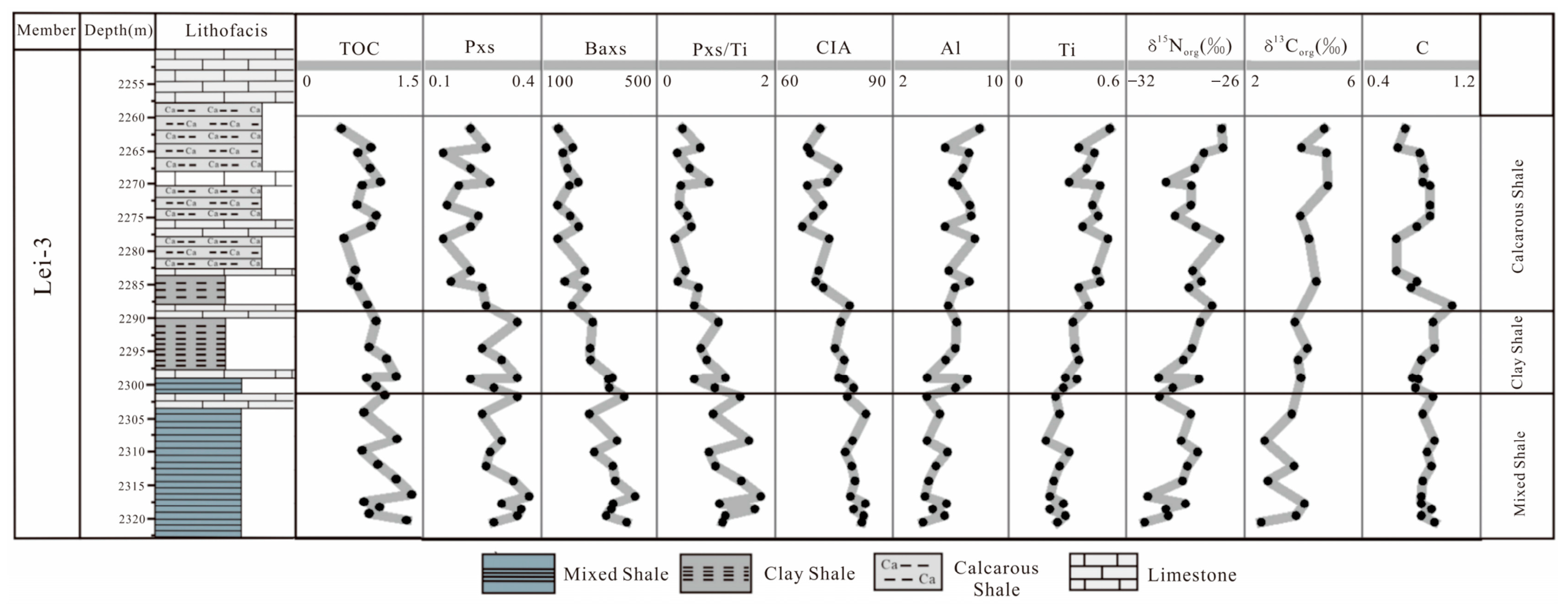 While the recent identification of the Lei3 shale is a significant breakthrough [12], key aspects of this unit are still poorly constrained, creating critical knowledge gaps. First, a detailed depositional model that explains the lateral and vertical heterogeneity of the Lei3 shale is lacking. Second, the relative importance of tectonic activity, paleoclimate, ocean productivity, and redox conditions in controlling organic matter enrichment has not been systematically evaluated. Is the primary novelty the detailed reconstruction of the depositional model for this newly identified unit, the investigation of the tectonic–climate–productivity interplay, or its specific hydrocarbon potential? Third, the hydrocarbon generation potential of the different shale lithofacies (mixed, clay, calcareous) remains to be quantitatively assessed.