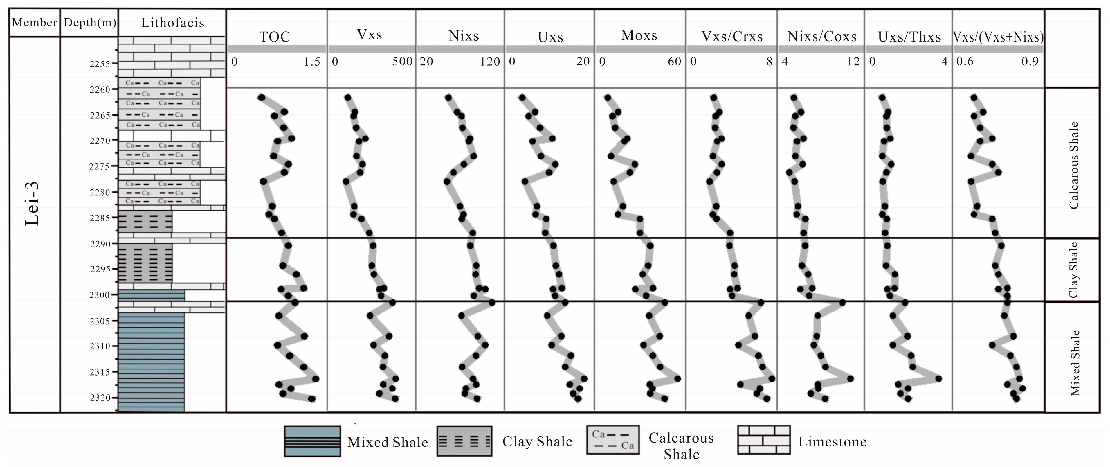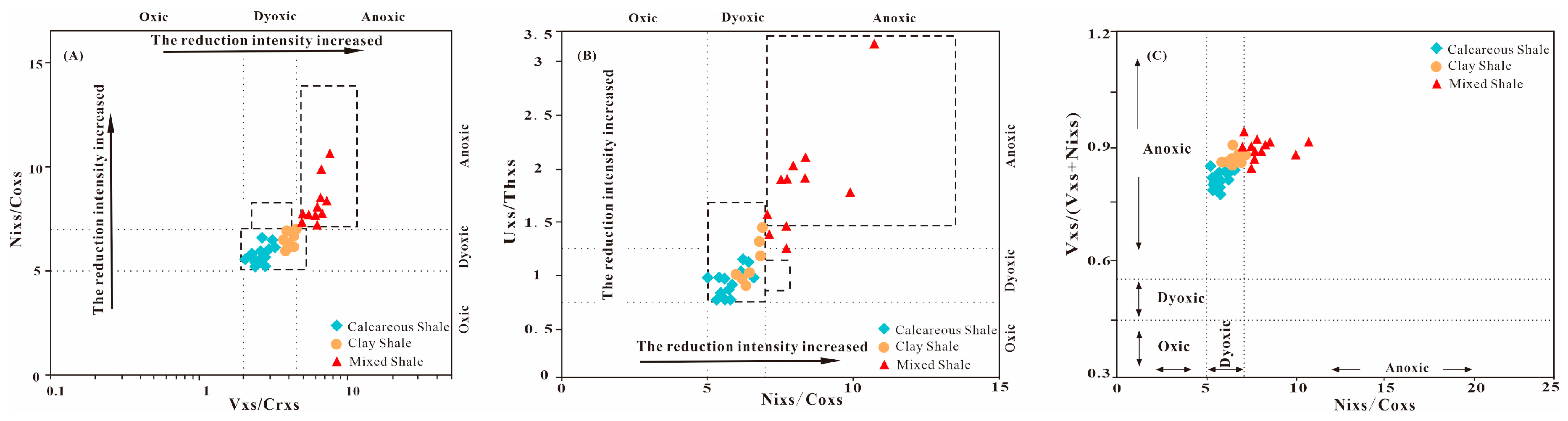 The V/Cr value distribution range was 2.04–7.56 (mean: 4.21), with the distribution ranges of mixed shale, clay shale and calcareous shale being 4.6–7.56, 3.8–4.51, and 2.04–3.11, respectively (mean values of 6.18, 4.08, and 2.62, respectively). The distribution range of Ni/Co values was 5.06–10.73 (mean: 6.84) with the ranges of mixed shale, clay shale and calcareous shale being 7.05–10.73, 6.08–7.18, and 5.06–6.54 (with mean values of 8.24, 6.59, and 5.81, respectively). The V/(V + Ni) values ranged from 0.66 to 0.83 (mean: 0.74), with the ranges of mixed shale, clay shale, and calcareous shale being 0.78–0.83, 0.74–0.77, and 0.66–0.73, respectively (with mean values of 0.8, 0.75, and 0.69, respectively). The distribution range of U/Th values was 0.79–3.39 (mean: 1.33) with the ranges of mixed shale, clay shale and calcareous shale being 0.79–1.02, 1.02–1.28, and 1.36–3.39 (with mean values of 0.95, 1.11, and 1.94, respectively). The range of MoXS values was from 8.38 to 54.78 (mean: 29.25). The distribution range of mixed shale, clay shale and calcareous shale was 32.12–54.78, 26.7–38.37, and 8.38–29.73, respectively (with mean values of 40.93, 33.13, and 17.29, respectively). The UXS values ranged from 3.84 to 17.74 (mean: 10.66). The distribution range of mixed shale, clay shale and calcareous shale was 9.45–17.74, 9.02–12.77, and 3.84–11.27 (with mean values of 14.09, 11.16, and 7.49, respectively). The range of Sr/Ba values was from 0.54 to 1.52 (mean: 0.88).