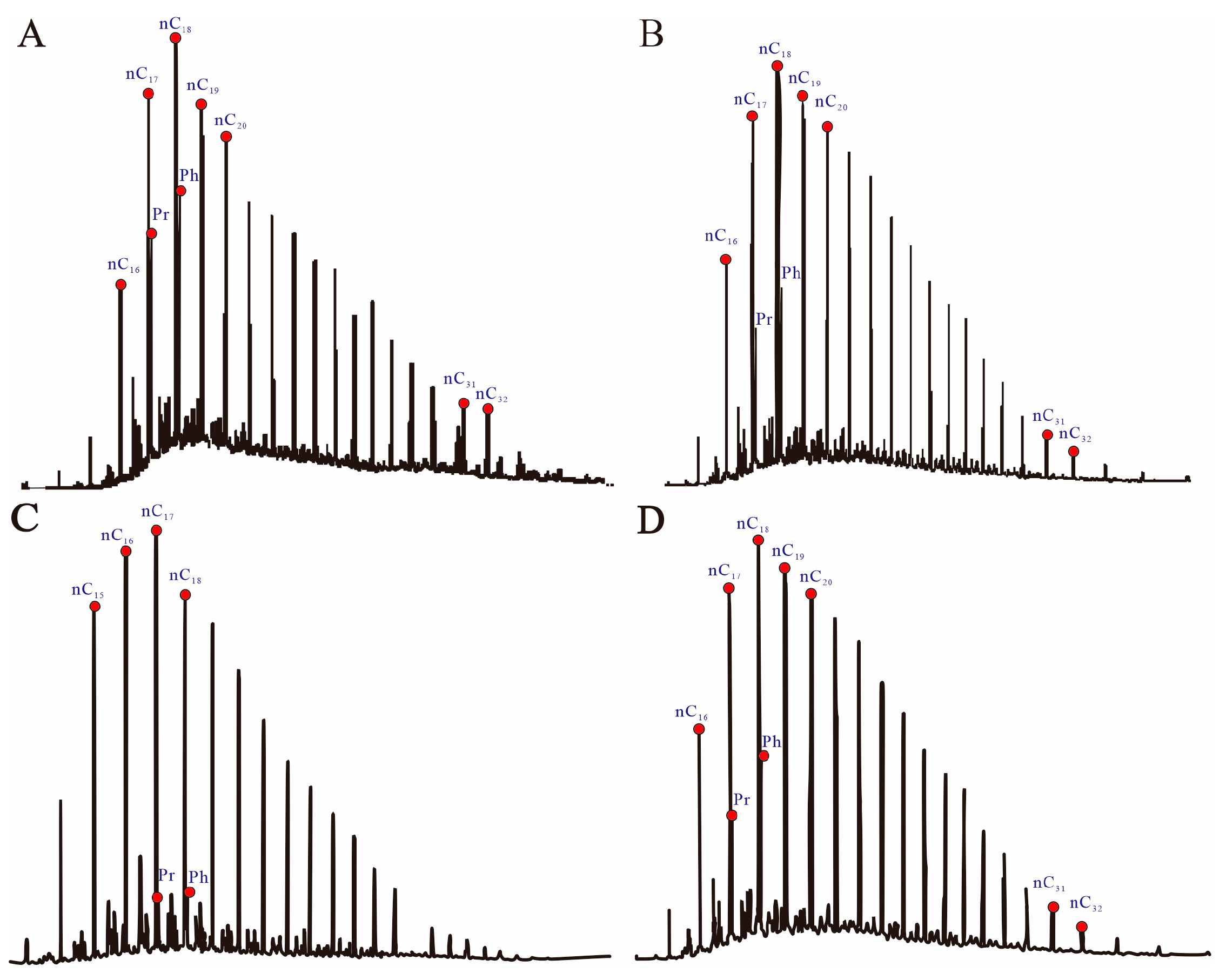 Figure 7. Distribution of n-alkanes in Lei3-2 Shale. (A) HC125 well, mixed shale, 2311.55 m, Lei3; (B) HC125 well, clay shale, 2303.45 m, Lei3; (C) CT1, Anisian [60]; (D) S47, Anisian [61].