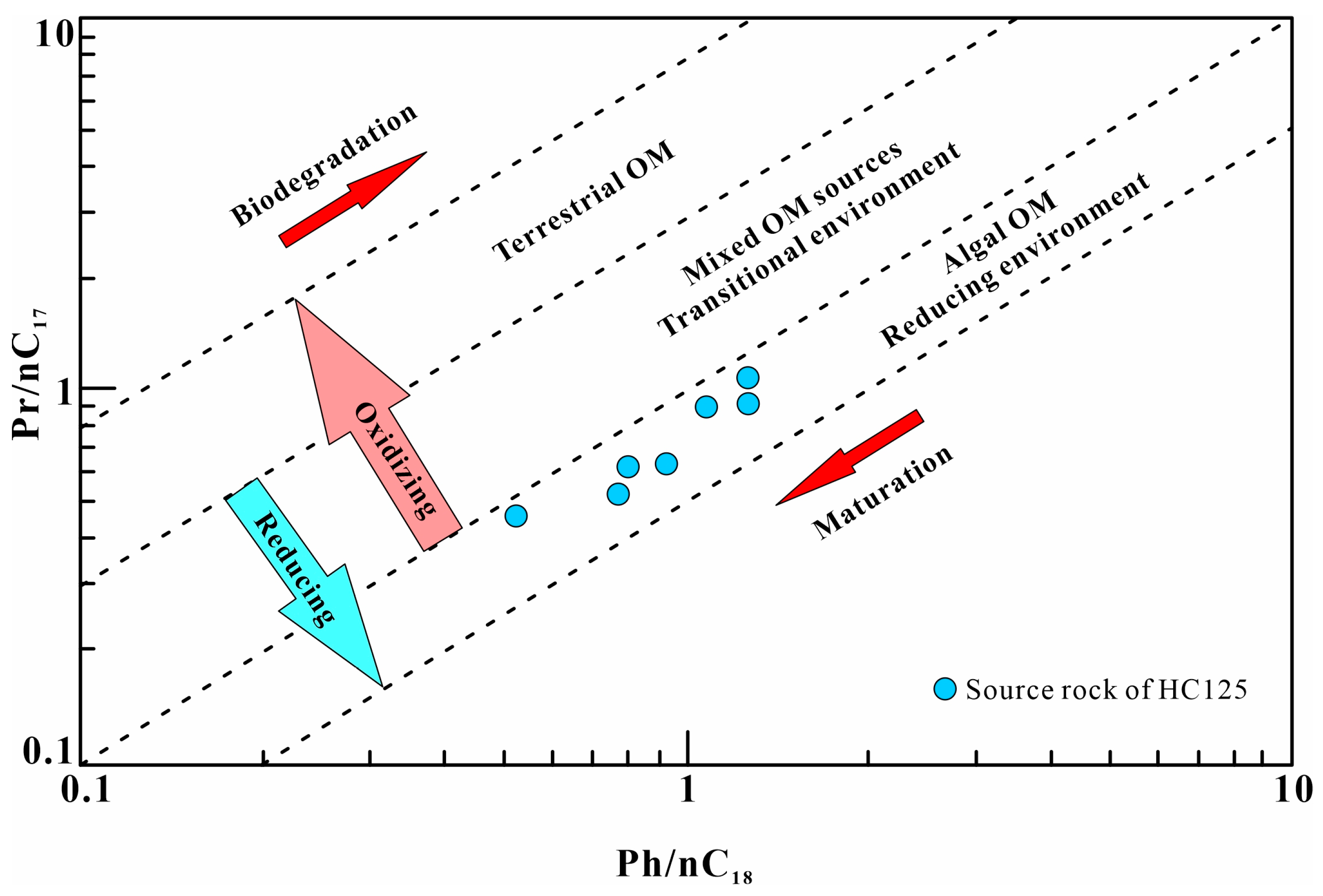 Figure 8. Ratio diagram of Pr/nC17 and Ph/nC18. The data for HC125 shale source rocks falls within Zone of algal OM reducing environment.