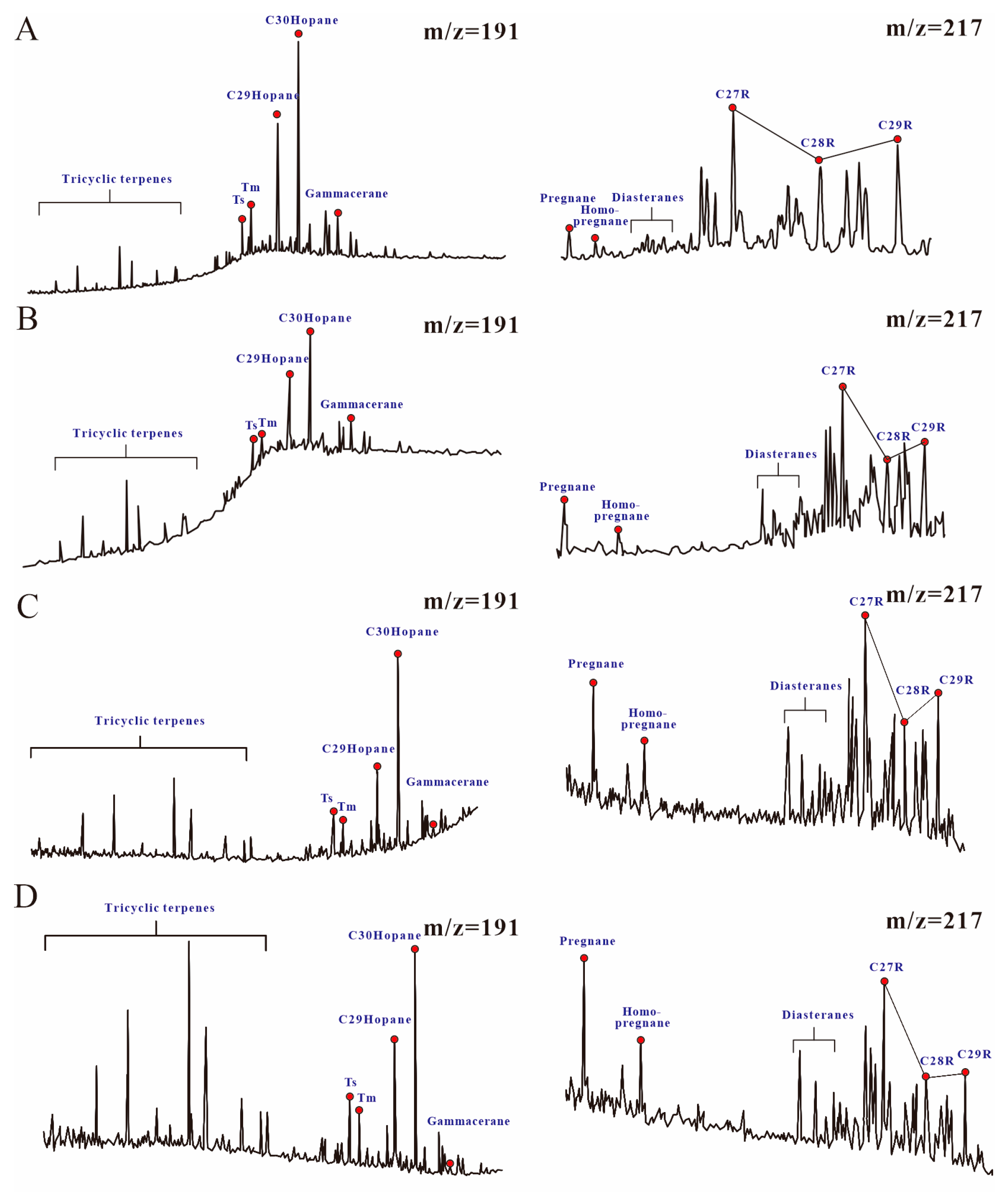 Figure 9. Distribution of Sesquiterpanes and Steranes in Lei3 shale. (A) HC125, Mixed Shale, 2311.55 m, Lei3-2; (B) HC125, Clay Shale, 2303.45 m, Lei3-2; (C) JY1, 2642.38 m [42]; (D) CT1, 3560.75 m [42].