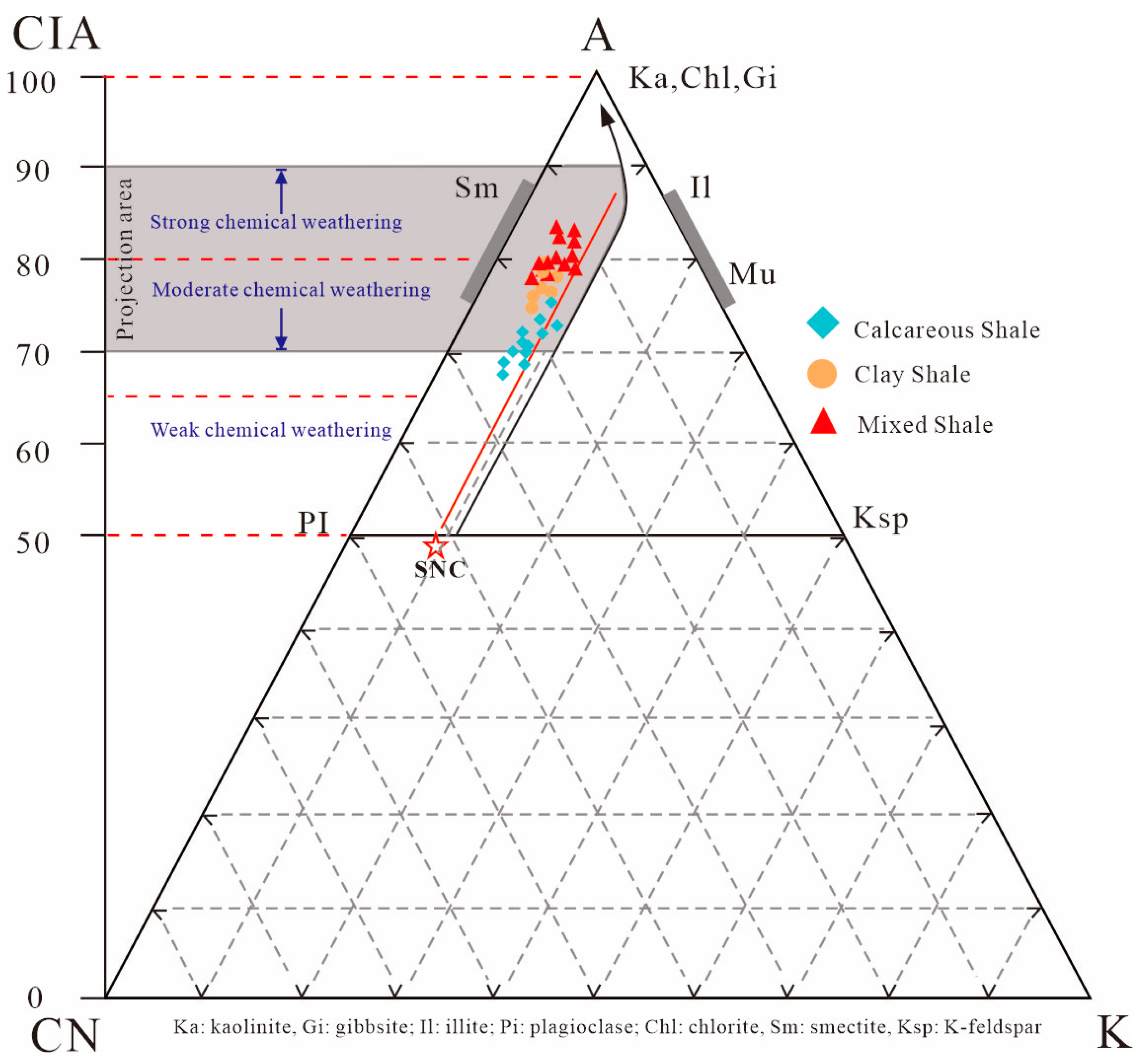 Figure 10. Chemical compositional variations in the Lei4 shale in the A–CN–K ternary diagram and associated chemical index of alteration (CIA) variations [88].