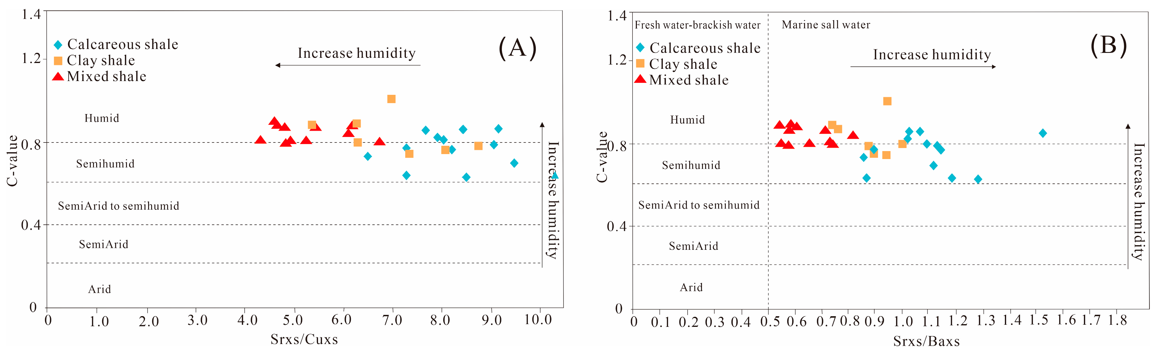 Figure 11. Cross plots of redox proxies of Lei3 shale in HC125. (A) Cross plots of Sr/Cu and C-value. (B) cross plots of Sr/Ba and C-value.