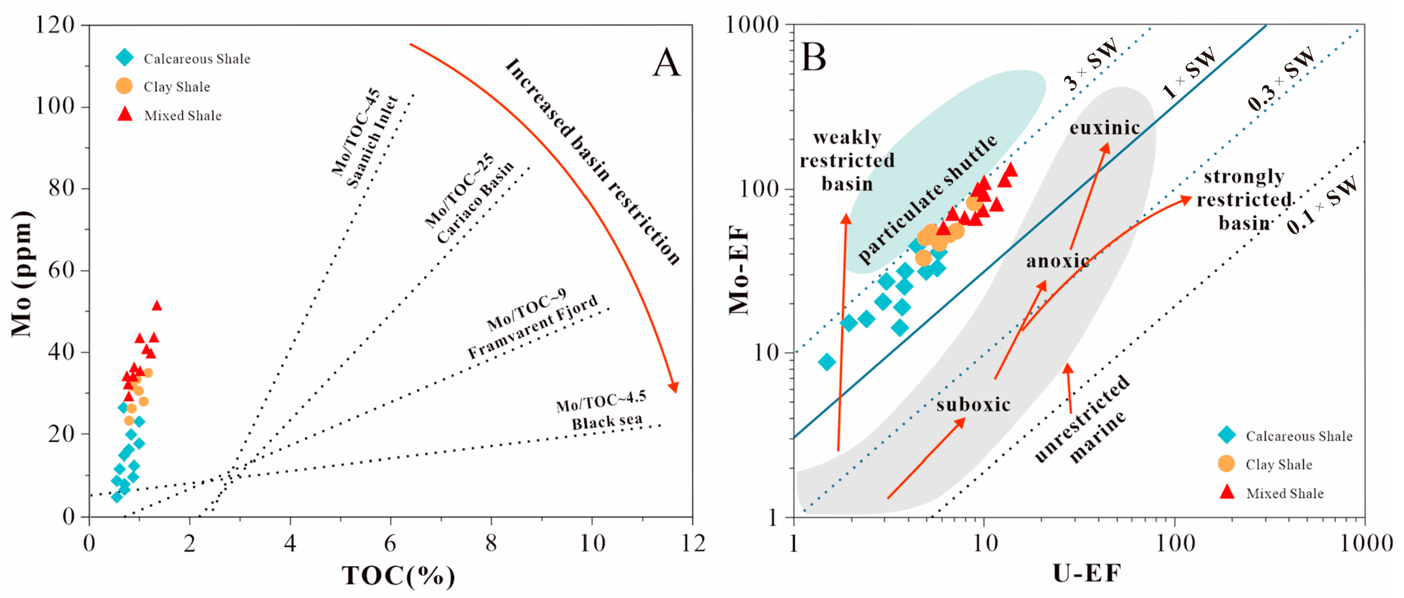 Figure 13. (A) Mo-TOC correlations showing the water column restriction level of Lei3 shale [116]; (B) Covariation of MoEF and UEF [57] showing the water column redox conditions of Lei3 shale.