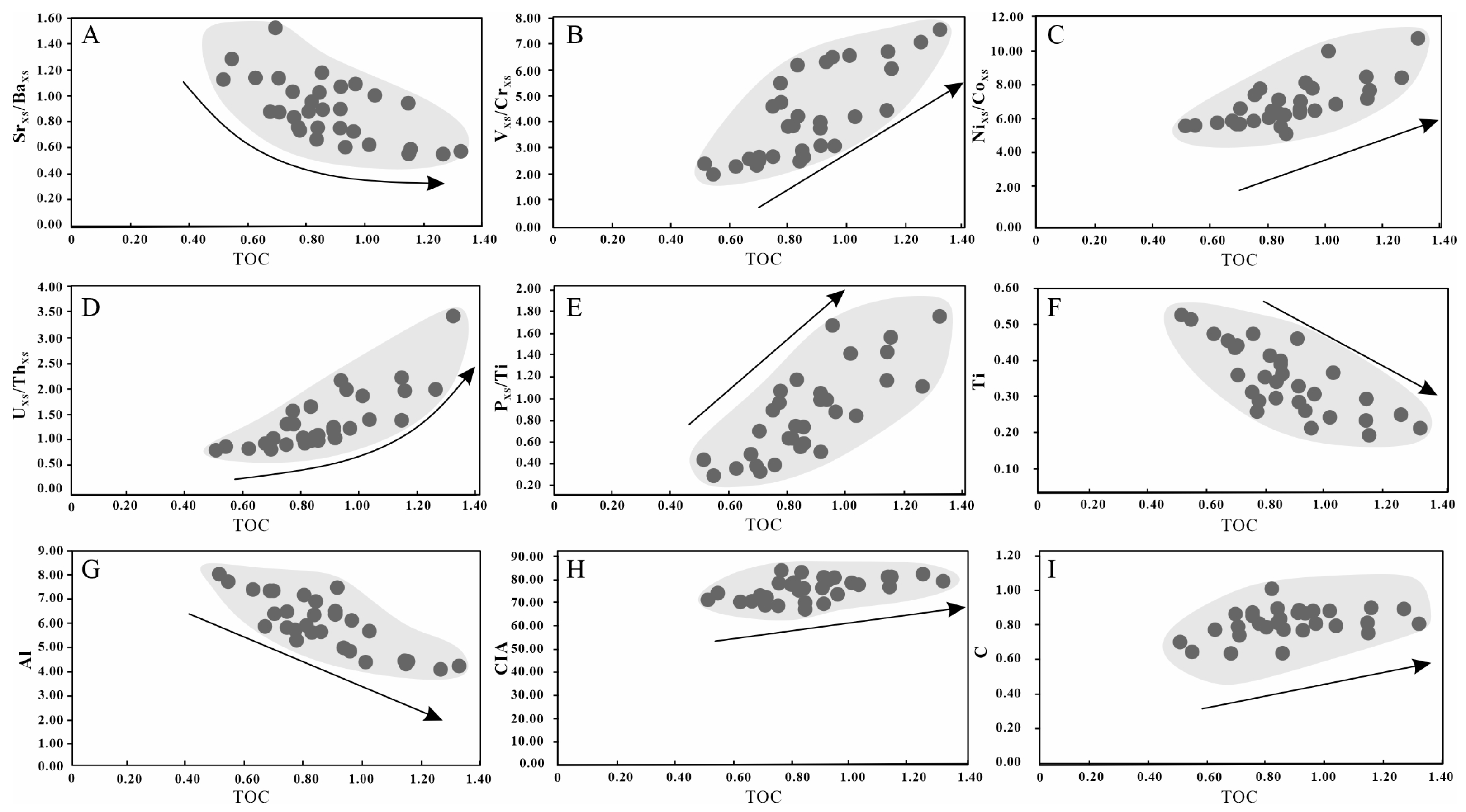 Figure 14. Correlation of TOC with Geochemical Indicators of Lei3 shale. (A) Correlation of SrXS/BaXS and TOC; (B) Correlation of VXS/CrXS and TOC; (C) Correlation of NiXS/CoXS and TOC; (D) Correlation of UXS/ThXS and TOC; (E) Correlation of PXS/Ti and TOC; (F) Correlation of Ti and TOC; (G) Correlation of Al and TOC; (H) Correlation of CIA and TOC; (I) Correlation of C index and TOC.