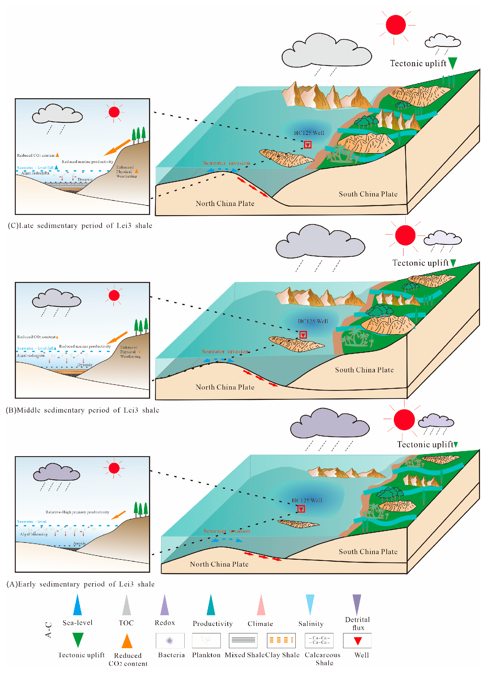 Figure 15. Sedimentary model of the Lei3 shale of HC125. The location of well and variations in shale components are schematic. (A) Early sedimentary period of Lei3 shale, accompanied by mixed shale deposition. (B) Middle sedimentary period of Lei3 shale, accompanied by clay shale deposition. (C) Late sedimentary period of Lei3 shale, accompanied by calcareous shale deposition.