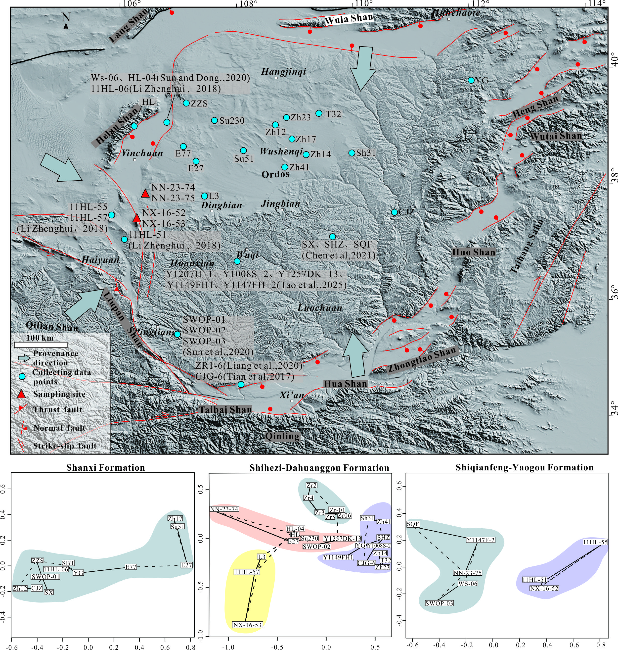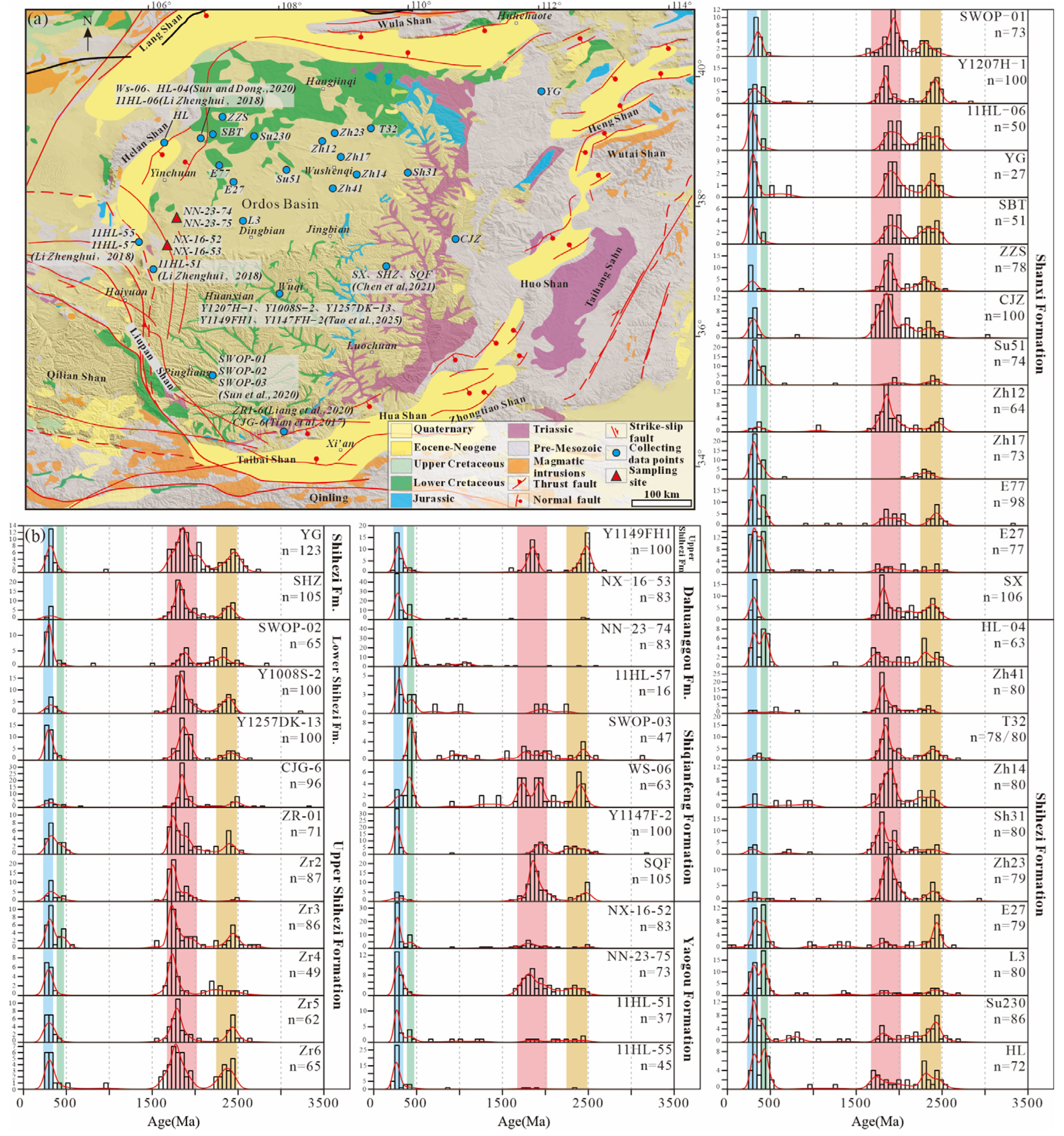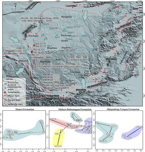 The Permian provenance of the Ordos Basin can be classified into three systems: the southwestern system sourced from the West Qinling Orogenic Belt and North Qilian Orogenic Belt; the northwestern system sourced from the Alxa Block and Yinshan-Daqingshan-Wulashan Orogenic Belt; and the interior system primarily sourced from the Yinshan-Daqingshan-Wulashan Orogenic Belt.