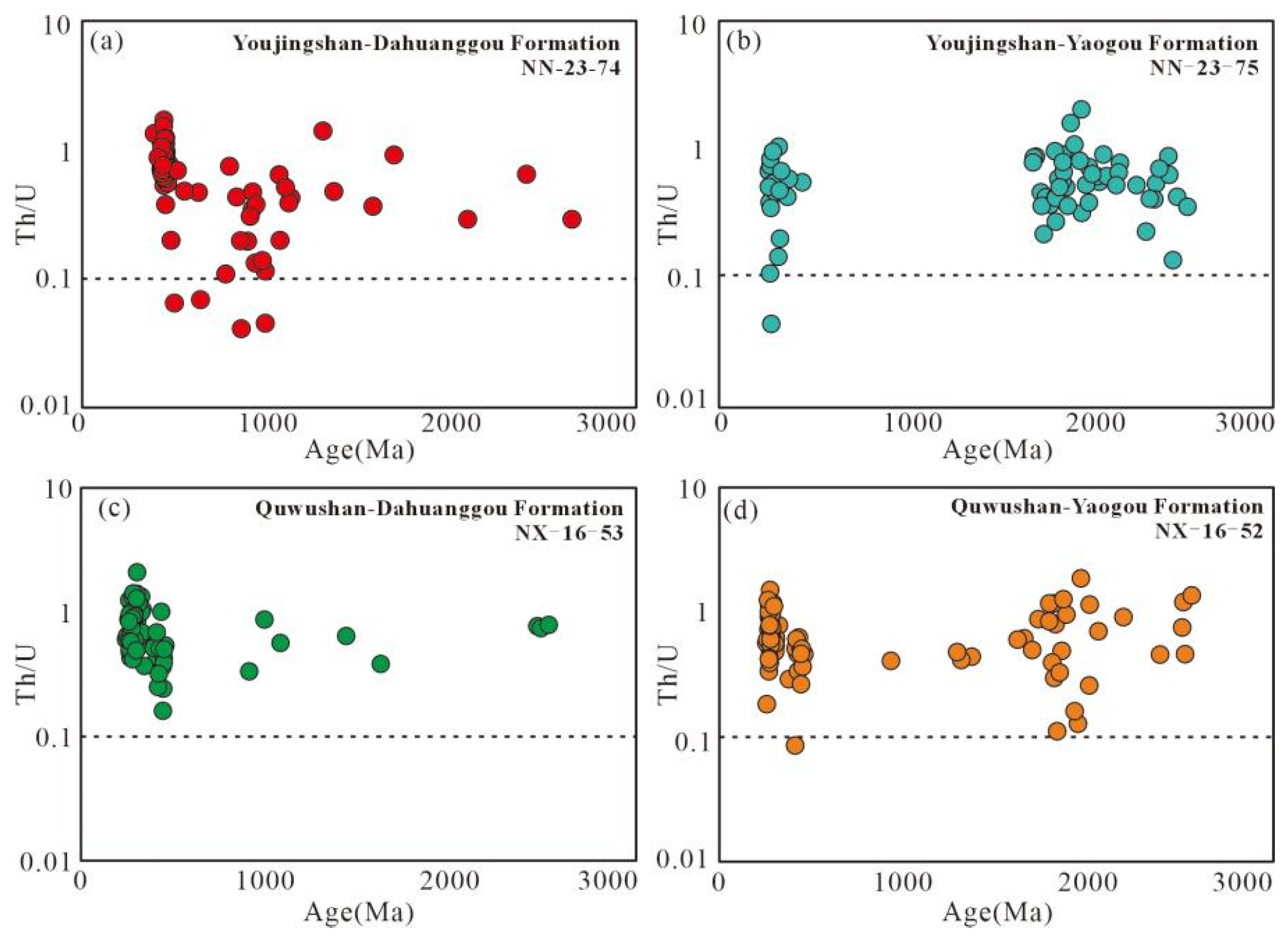Figure 3. Th/U ratio plot of zircon grains from the Permian sandstone from Youjingshan and Quwushan areas. (a) Sample NN-23-74; (b) Sample NN-23-75; (c) Sample NX-16-53; (d) Sample NX-16-52.