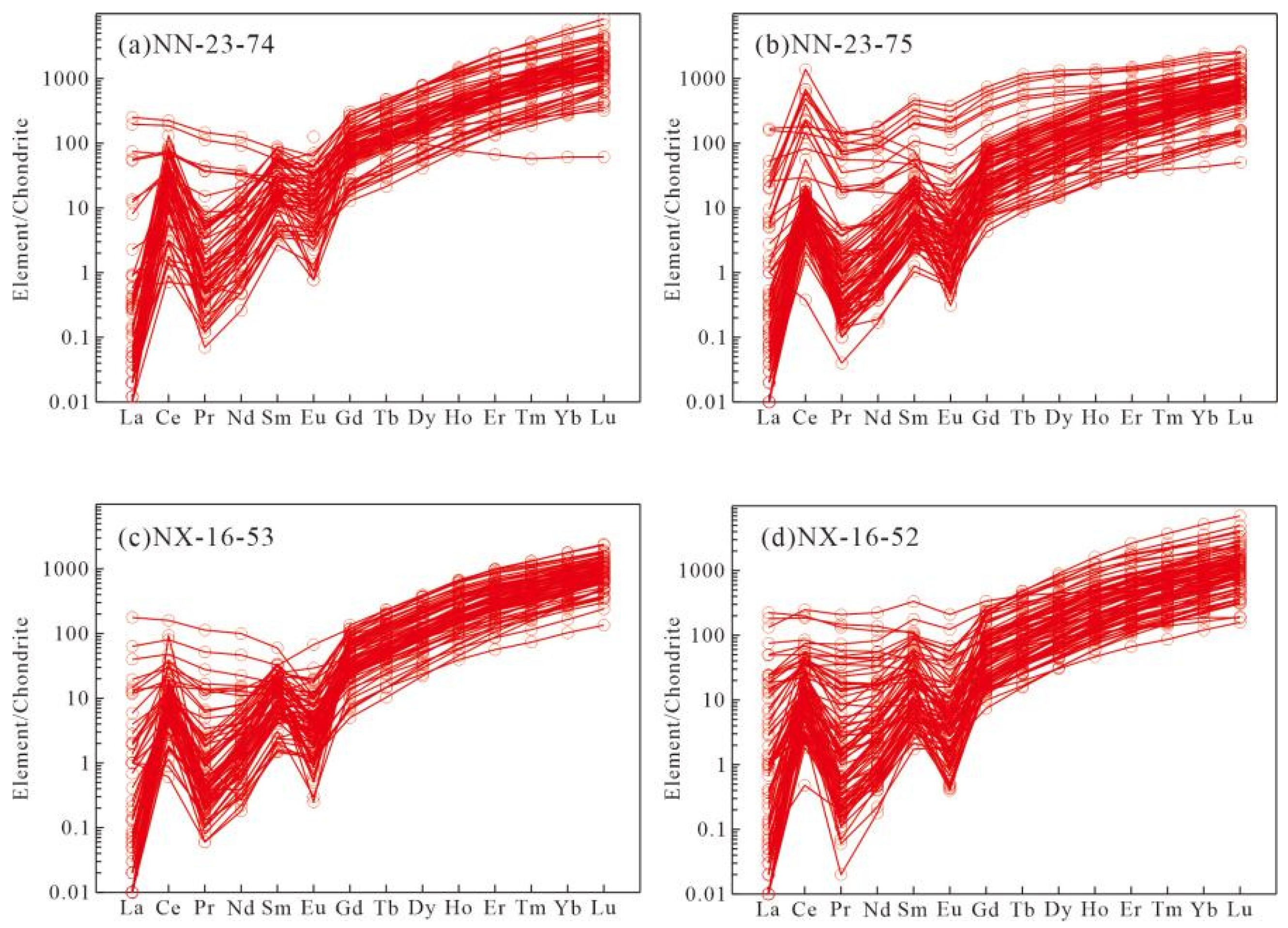 Figure 4. Rare earth element (REE) partition patterns of zircon grains from the Permian sandstone from Youjingshan and Quwushan areas. (a) Sample NN-23-74; (b) Sample NN-23-75; (c) Sample NX-16-53; (d) Sample NX-16-52.