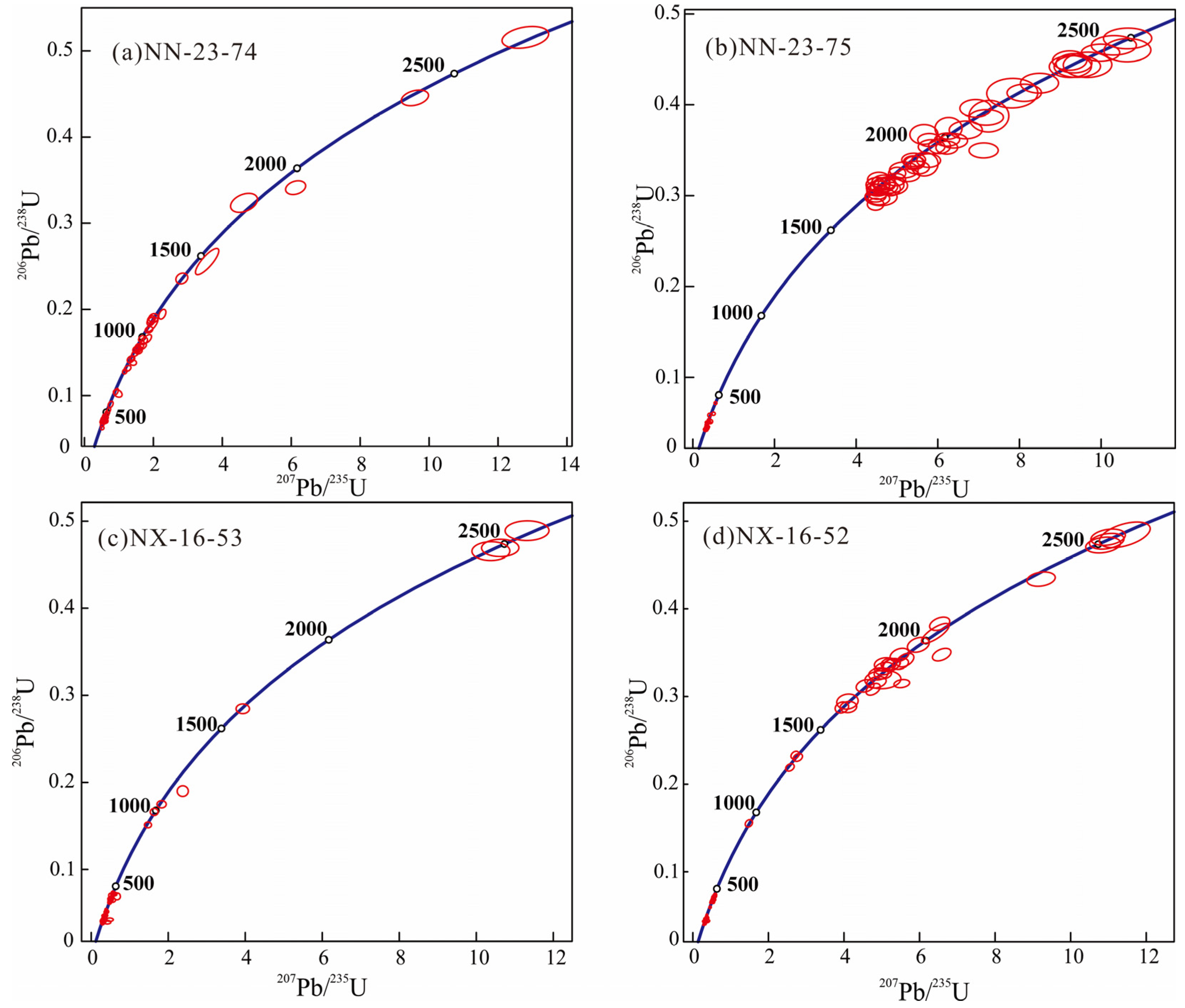 Figure 5. Zircon concordia diagram of zircon grains from the Permian sandstone from the Youjingshan and Quwushan areas of the WOB. (a) Sample NN-23-74; (b) Sample NN-23-75; (c) Sample NX-16-53; (d) Sample NX-16-52.