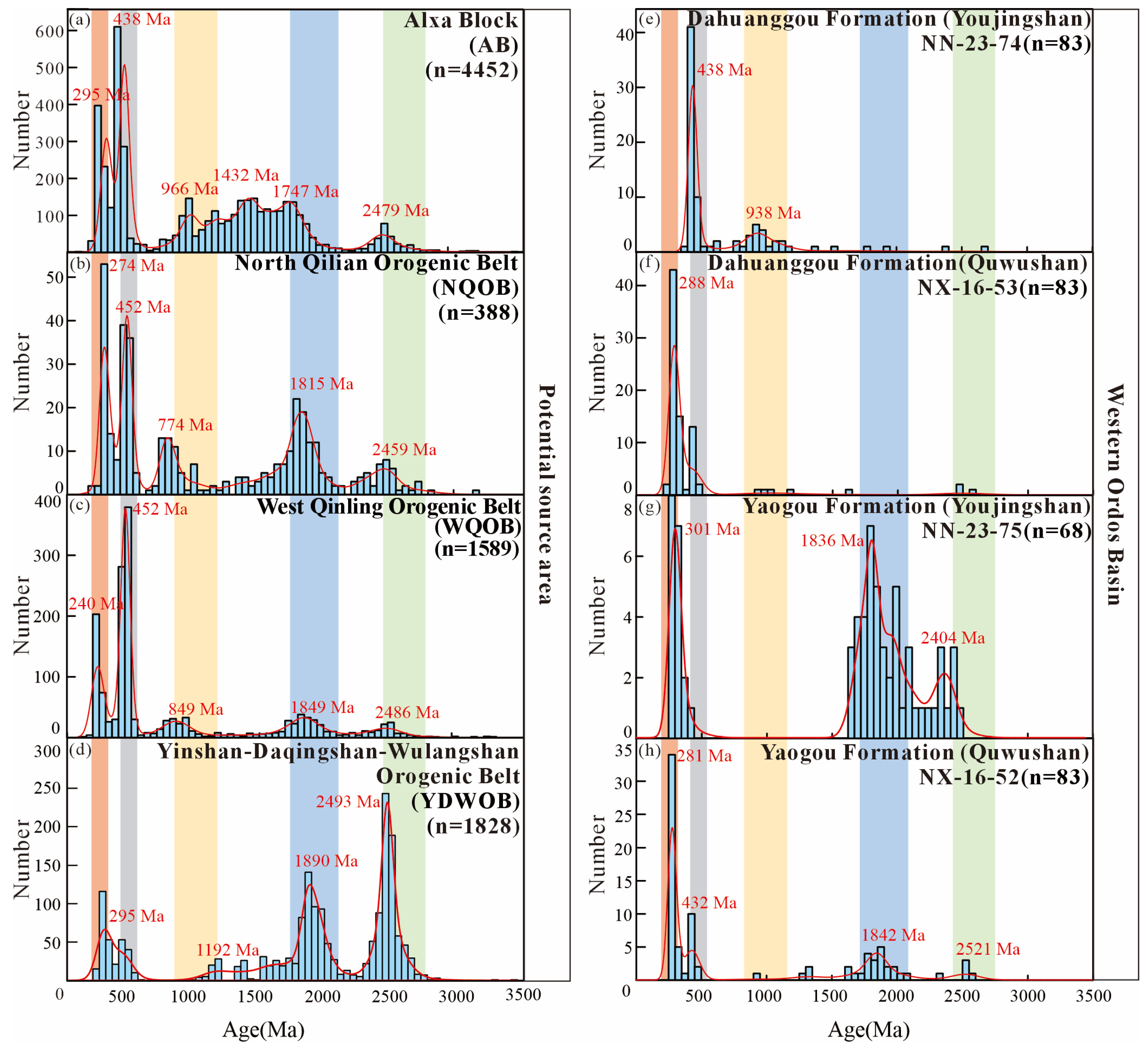 By comparing the detrital zircon U-Pb ages from the study area with those of potential source regions, it is concluded that the provenance of the Dahuangou Formation in the Youjingshan area was the Alxa Block, while the provenance of the Yaogou Formation was mainly derived from the Yinshan-Daqingshan-Wulashan Orogenic Belt. In contrast, the source areas for both the Dahuangou and Yaogou formations in the Quwushan area were the West Qinling Orogenic Belt and North Qilian Orogenic Belt. It is noteworthy that the two samples from Youjingshan exhibit significant differences in age distributions and peak ages, indicating a pronounced shift in provenance during this period.