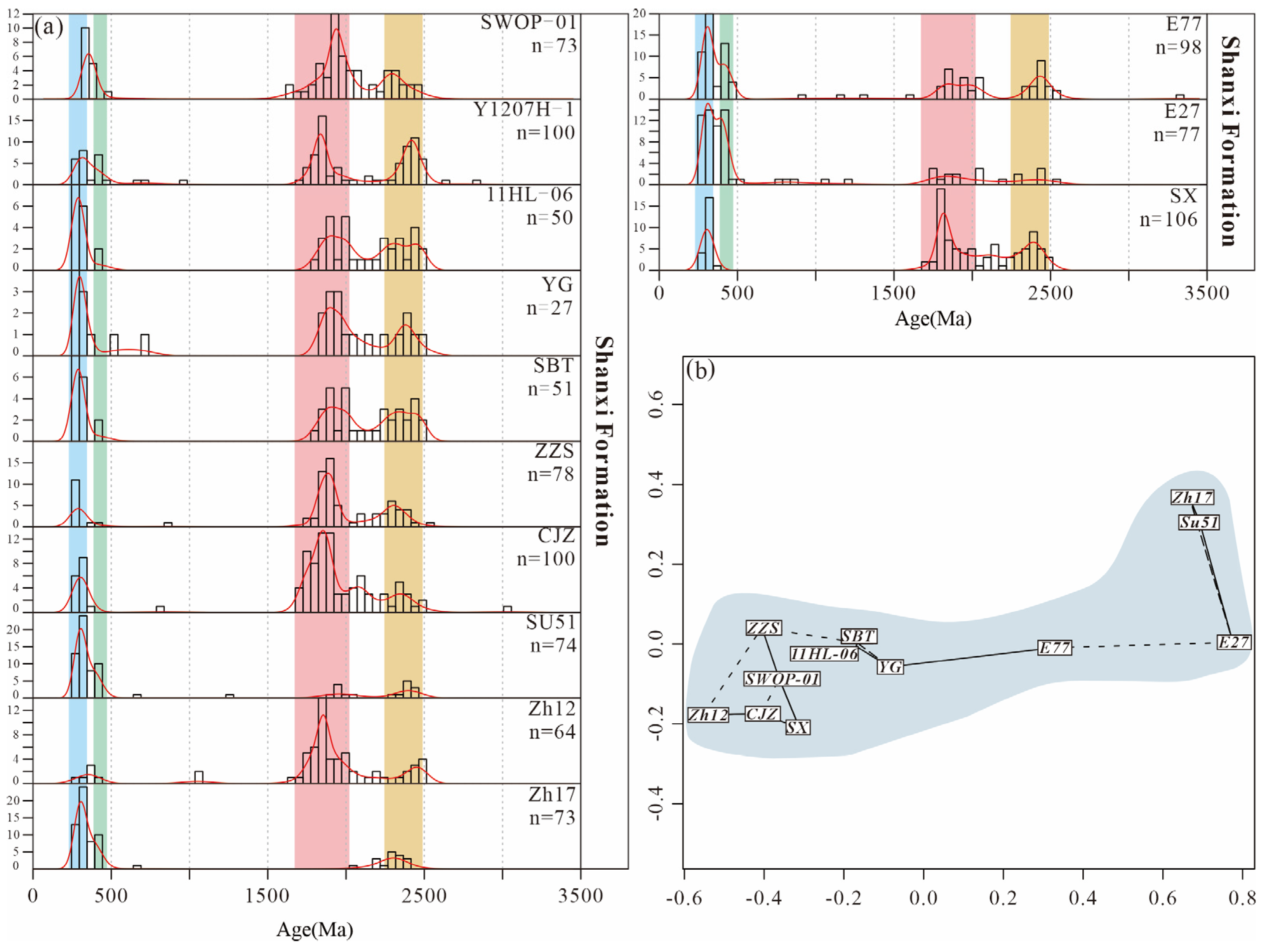 Figure 9. (a) Zircon U-Pb age frequency distribution diagram of the Shanxi Formation; (b) MDS analysis diagram of the Shanxi Formation.