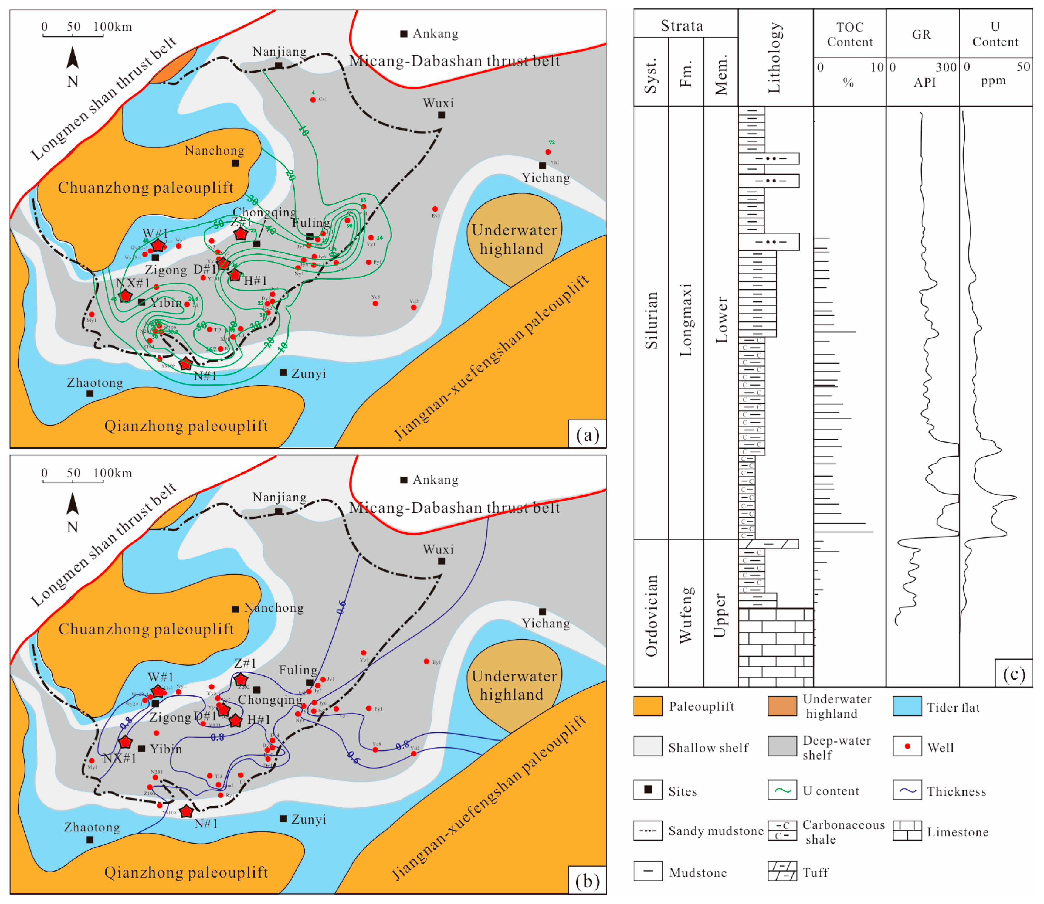 Figure 1. Lithofacies paleogeography and stratigraphic characteristics of the Sichuan Basin. (a) Paleogeographic map of the study area showing the distribution of maximum uranium content in shales; (b) Isopach map of the high-gamma-ray (GR) interval; (c) Typical lithology column of Well W#1. (Modified after [3]).