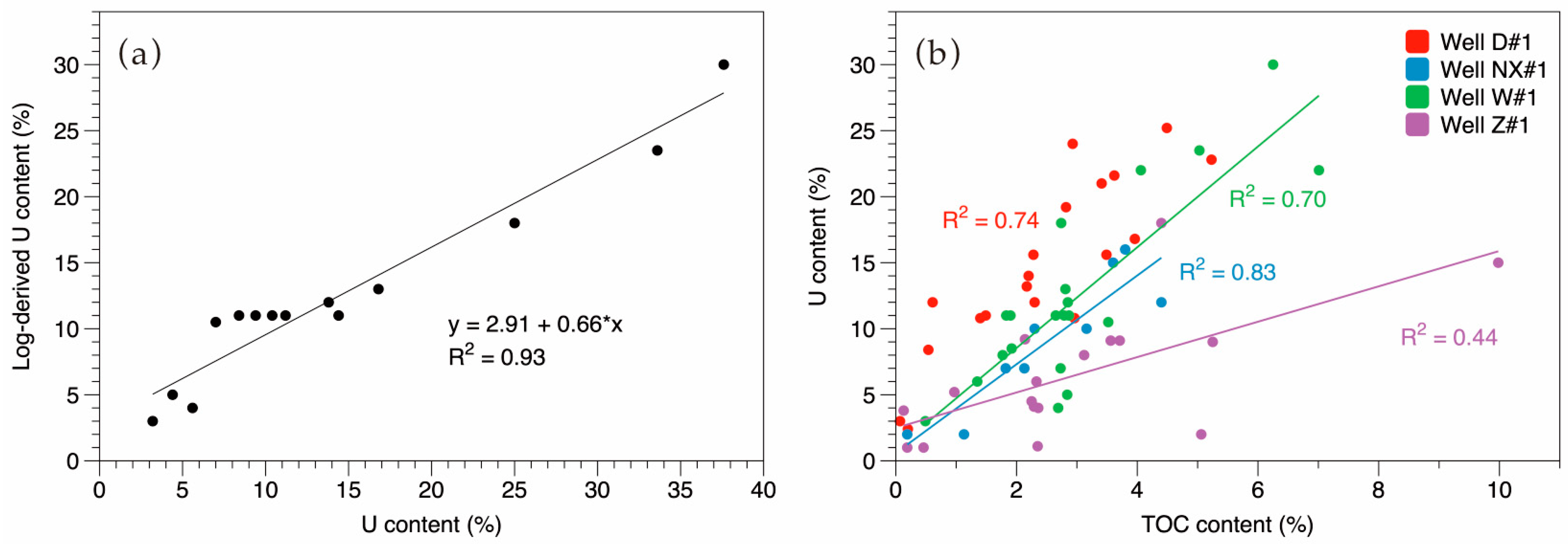 ICP-MS analysis of 28 samples from well W#1 indicates U contents ranging from 2.4 to 38.8 ppm, with an average of 14.4 ppm. A strong positive correlation is observed between measured uranium concentrations and log-derived U values (Figure 3a), demonstrating that spectral logging data provide a reasonably accurate representation of in situ U content. Log-based uranium concentrations in the studied intervals vary from 1 to 30 ppm, averaging 11 ppm, which is systematically lower than the laboratory-measured values. The relationship between TOC and U content (Figure 3b) suggests that uranium enrichment is closely associated with OM, implying that OM acts as the primary host phase for uranium accumulation. It is noteworthy, however, that the correlation coefficient between TOC and U content varies significantly among different well cores (Figure 3b).