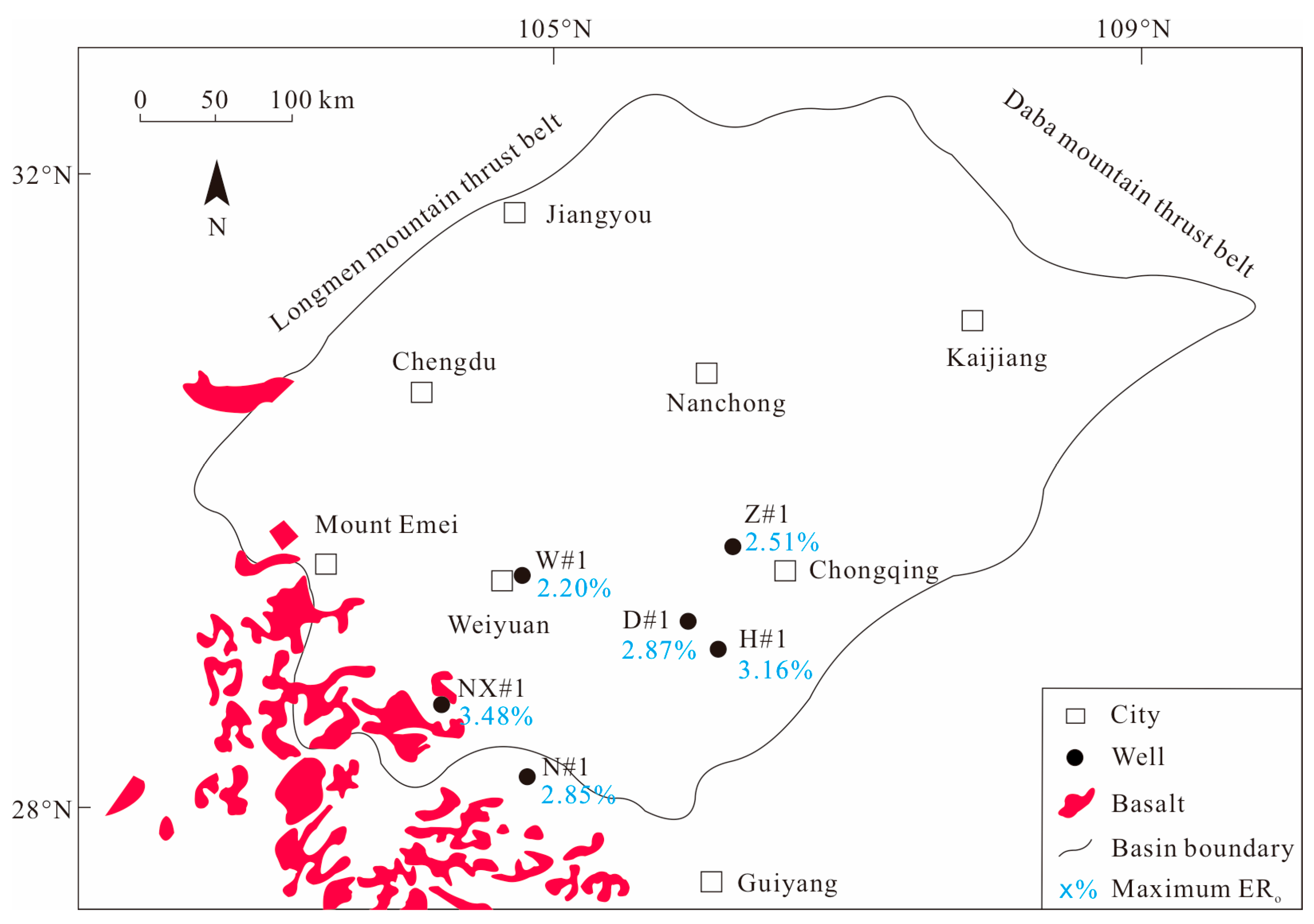 Figure 11. Regional distribution of the Emeishan basalt and its relationship to the vitrinite reflectance (Ro) of shales (modified from Ref. [55]).