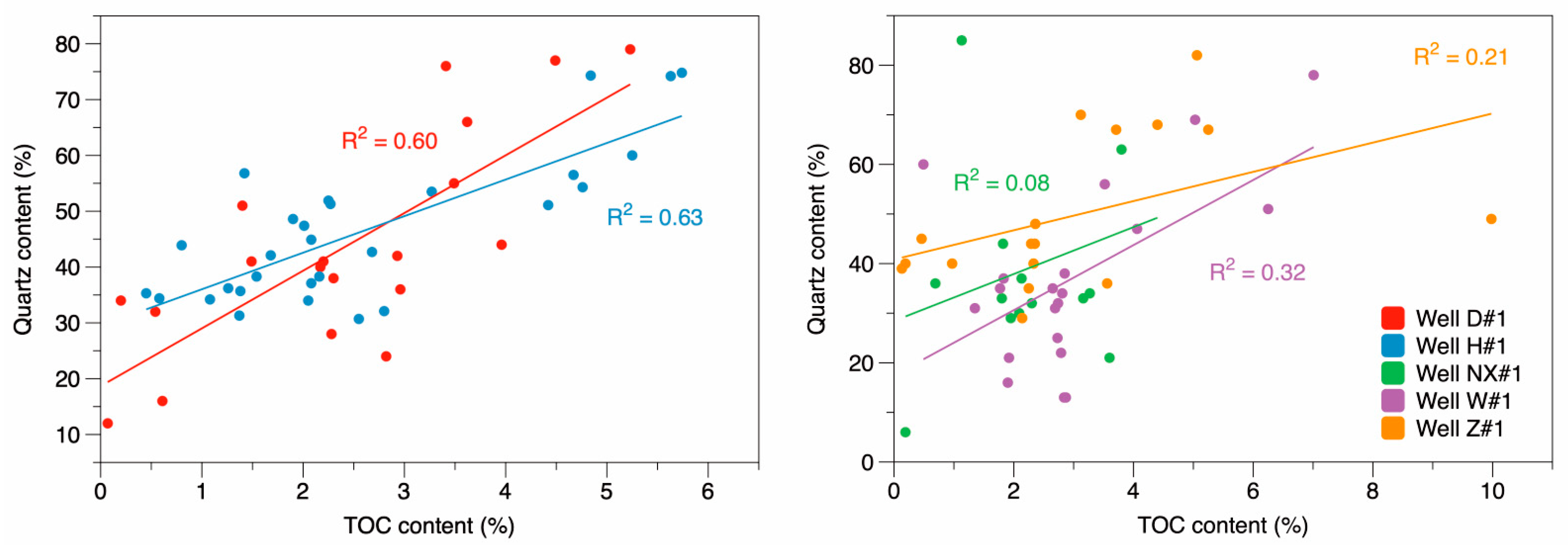 Silica in shales may originate from terrigenous, hydrothermal, or biogenic sources [63]. A positive correlation between TOC and quartz content in some wells (e.g., H#1 and D#1; Figure 12) suggests a significant biogenic silica contribution [64,65,66]. However, this correlation is weak or absent in other wells (e.g., Z#1, W#1, and NX#1; Figure 12), indicating variable silica origins.